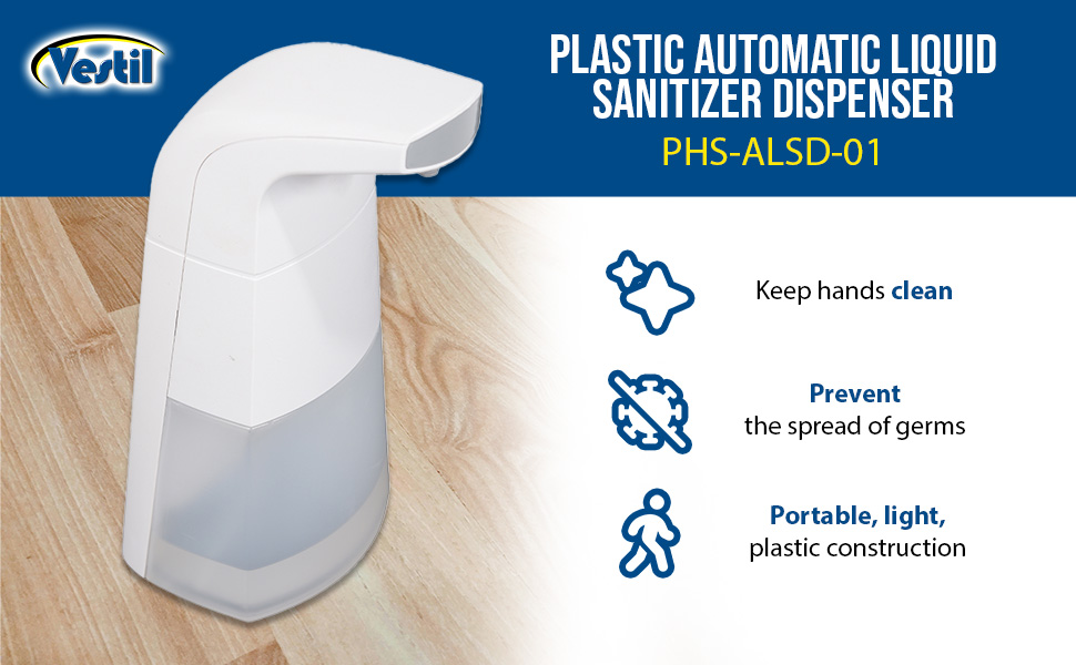PHS-ALSD-01 PHS-ALSD-01Plastic Automatic Liquid Sanitizer Dispenser 10-1/2 Fluid Ounce Capacity WhiteBatteries: (3) AA-Alkaline