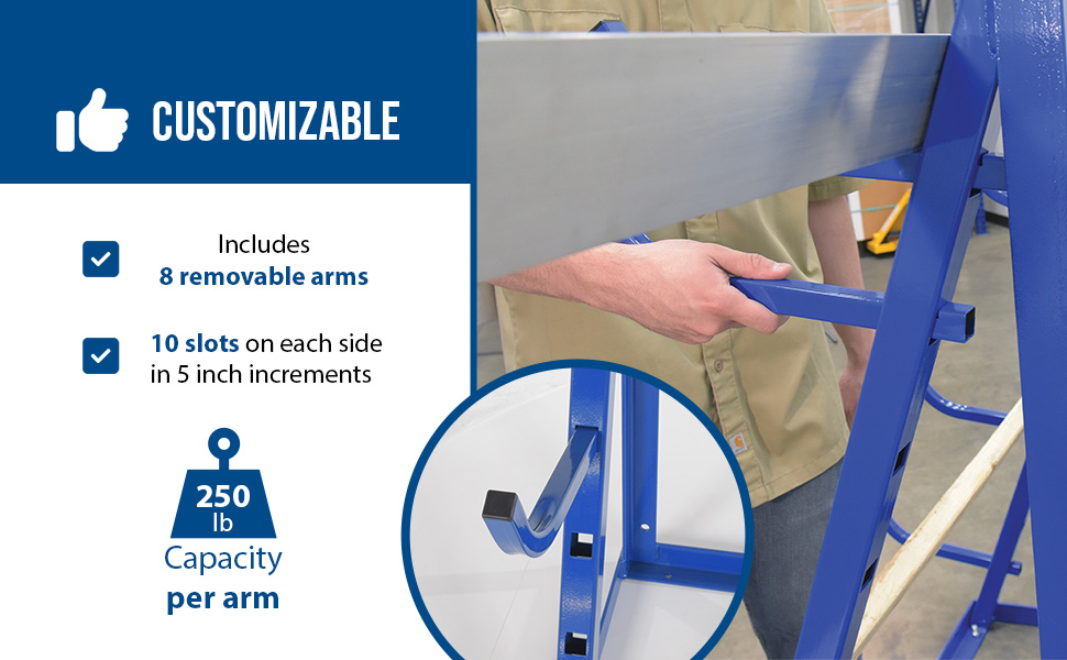 An adjustable bar and pipe storage rack is a great asset for work place organization and efficiency. With a durable steel construction, the rack and arms consistently hold heavy material. The rack arms can be adjusted to a variety of positions to best fit the users' needs. For additional safety, all rack arms are shaped vertically to prevent possible roll-offs of material. The open design also enables loading and unloading from 3 sides.