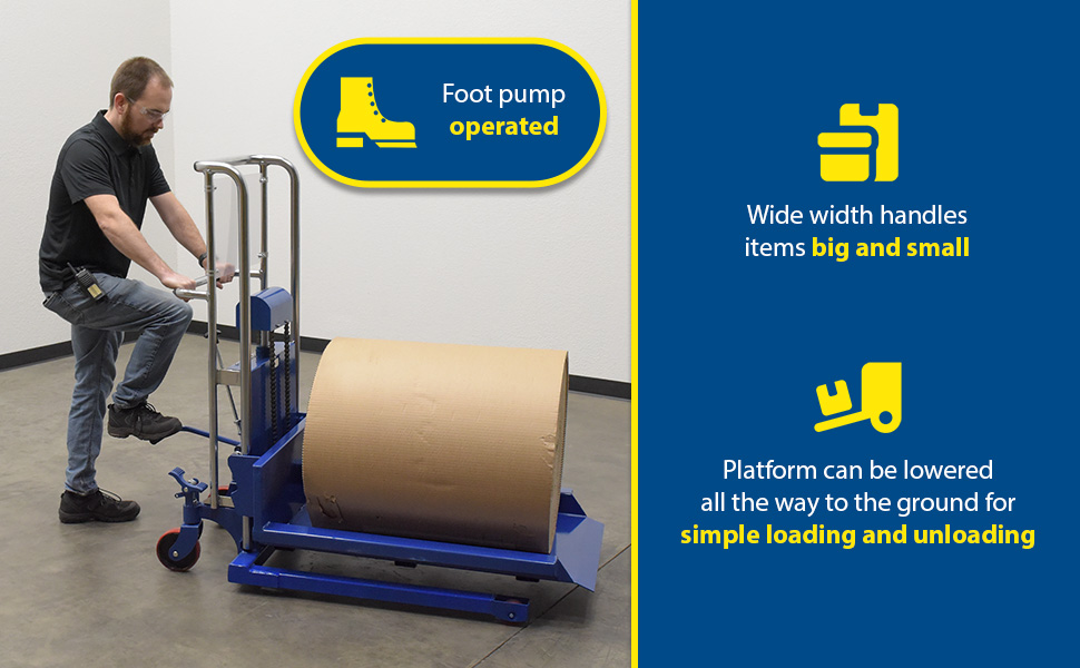 The Hefti-Lift units provide reliable powerful lifting when moving and positioning loads. The manual hydraulic foot pump yields 3/4" of platform travel per stroke, auto-shift models feature a two speed foot pump.The units roll smoothly on two rigid and two swivel poly-on-steel casters with foot operated brake. The units are designed of welded steel construction with chrome platforms and uprights (except model HYD-10-DA-SS) Each fork is 4-1/2"W x 2-1/2"H, the fork length is the same as the platform length. Overall fork width is 22". Not for use with pallets. Stainless Steel units are compact, lightweight, and capable of turning in a small radius when space is limited. A built-in automatic load check valve is included for improved safety. Model HYD-5-SS features a hydraulic foot pump, while model HYD-10-DA-SS comes with a dual acting manual hydraulic hand pump.