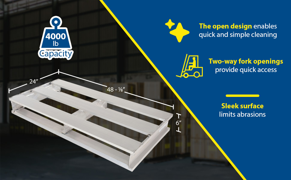 AP-4824 AP-4824Aluminum Heavy Duty Half Pallet 24 In. x 48-1/8 In. x 6 In. 4000 Lb. Capacity SilverUniform Capacity (lb.): 4,000