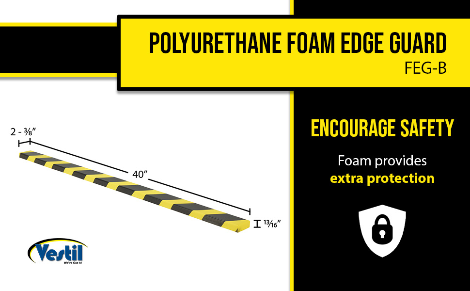 Versatile foam edge guards provided added protection when necessary. Each guard is manufactured from flexible foam that conforms to slightly irregular angles and surfaces Black and yellow alert striping. Sold in lengths of 40", easy to cut to custom lengths. Mounts with self-adhesive strips. Includes double sided tape for adhering.