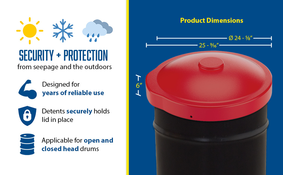 DC-P-55-UF-RD DC-P-55-UF-RDLow Density Polyethylene Drum Cover 55 Gallon Universal Fit RedOverall Diameter (in.): 24-5/8