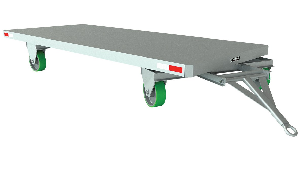 Fifth Wheel Steer Trailers feature steering that resembles children's little red wagons. These industrial workhorses move heavy loads around plants and distribution centers. 14" square steel plates sandwich a UHMW disk, secured by a 1-1/4" kingpin, comprising the massive fifth-wheel assembly. Equipped with proper couplers, fifth wheel steer trailers can be connected into "trains" to move even larger loads of merchandise. Front and rear axles are precisely located for optimal steering and load accommodation. Custom deck sizes and hardwood decks available, contact factory.