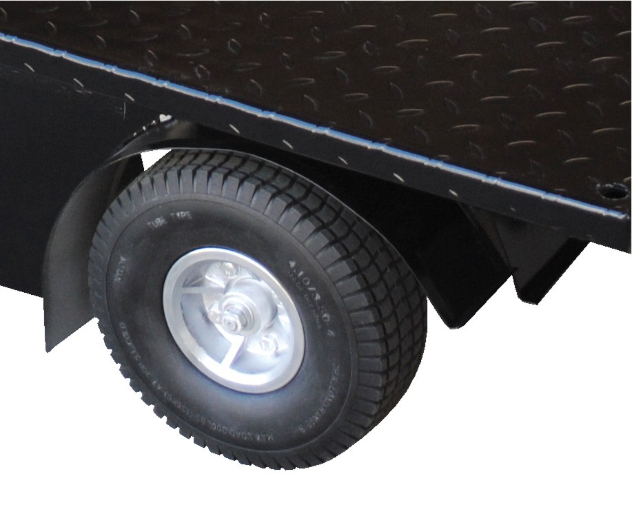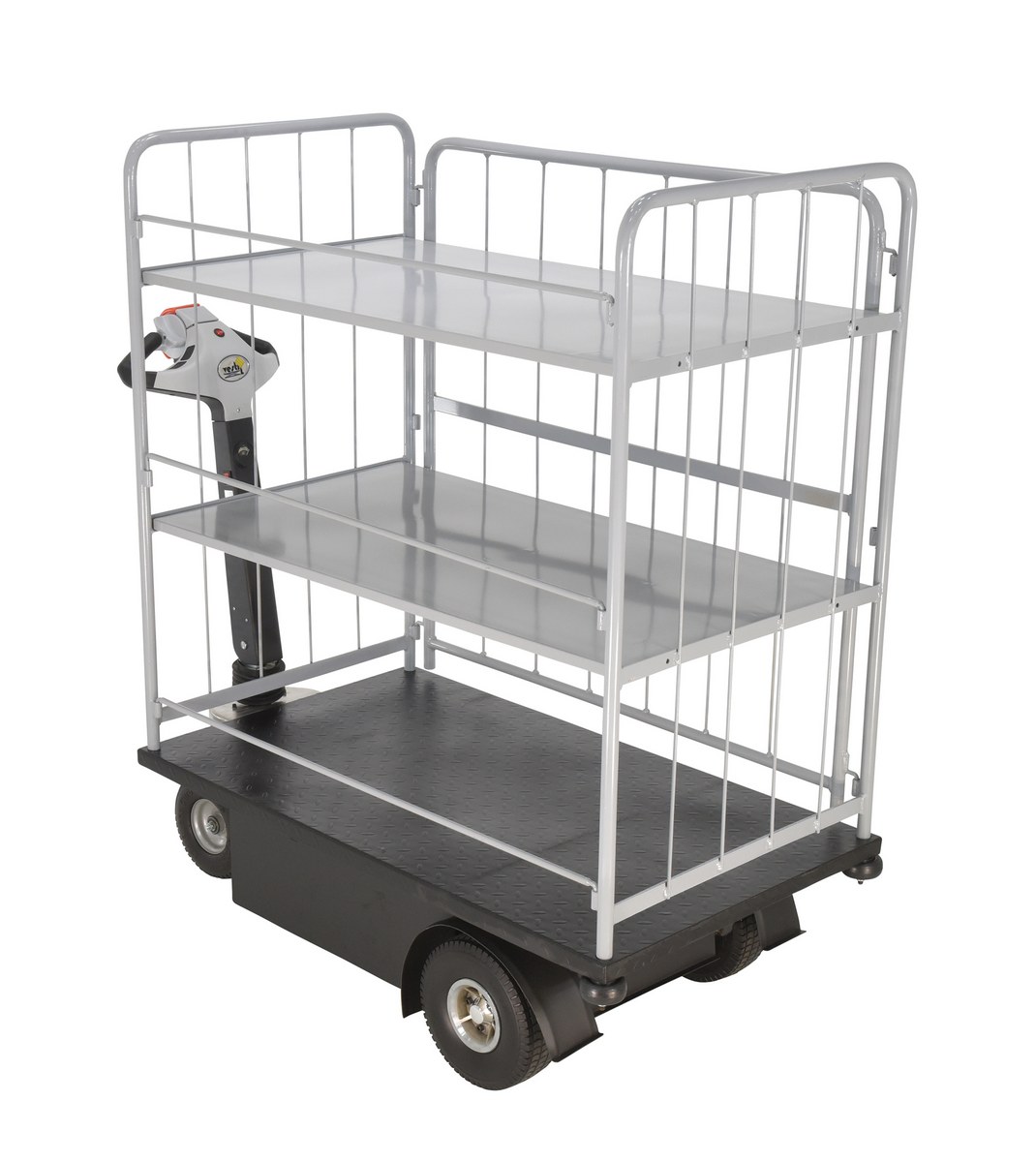 Unique carts feature built-in traction-drive system for easy transportability. Ideal for applications including mail rooms, hospitals, supermarkets, hotels and warehouses. Features 500W electric drive motor with two 70Ah batteries for power. 110V AC internal battery charger is included along with battery level indicator. Variable throttle speed control for precise maneuvering and positioning is located in the handle. Units roll smoothly on (2) 9" x 3-1/4" solid foam rubber steering wheels and (2) 10" x 3-1/4" solid foam drive wheels. Walking speed is 0-2.8 mph when unloaded and 0-1.5 mph when loaded. Speed control is conveniently located in handle. Handle pivots back towards operator and includes horn and emergency stop. Maximum incline is 7 degrees. Each shelf includes a tread plate surface. Deck height 14"