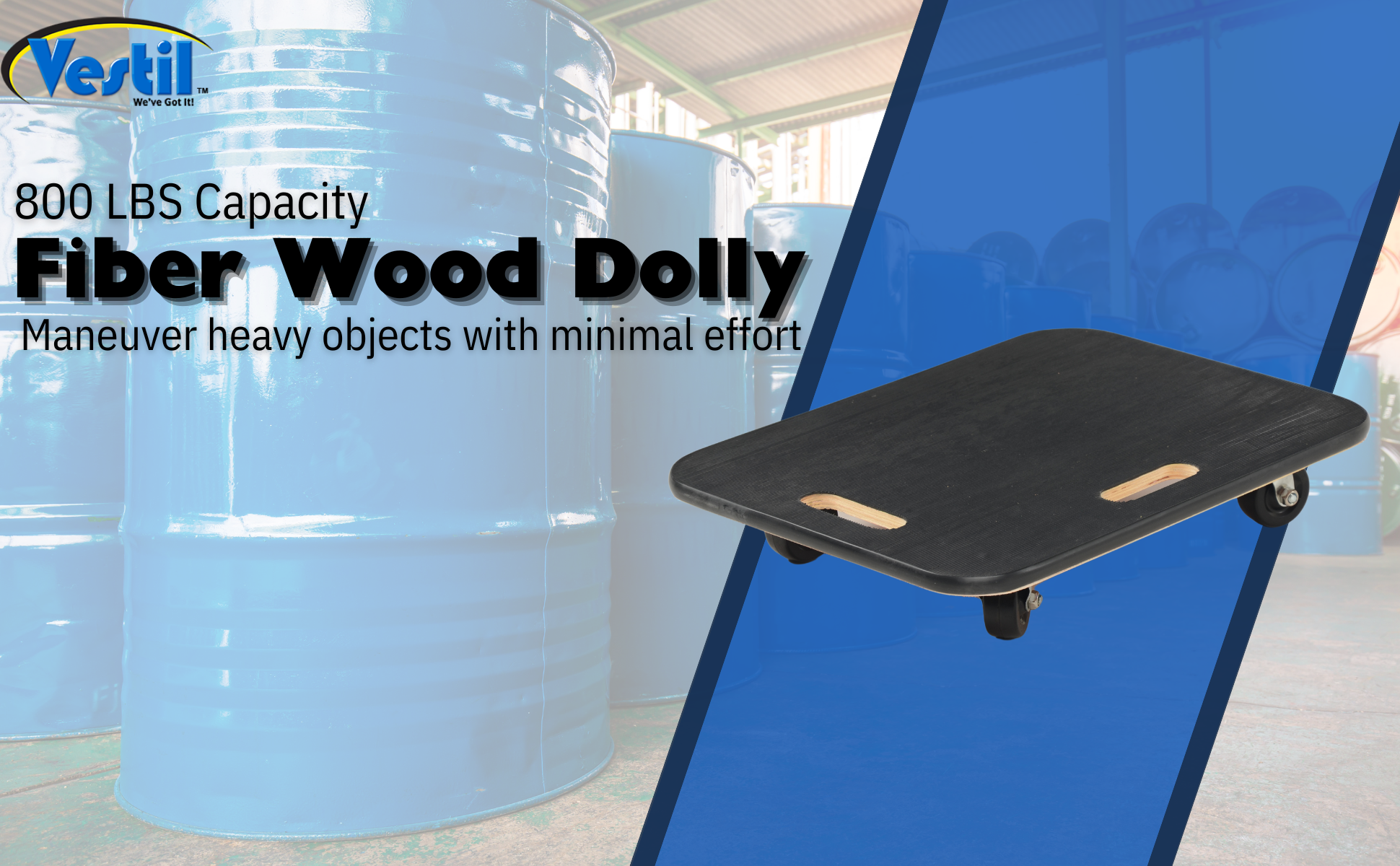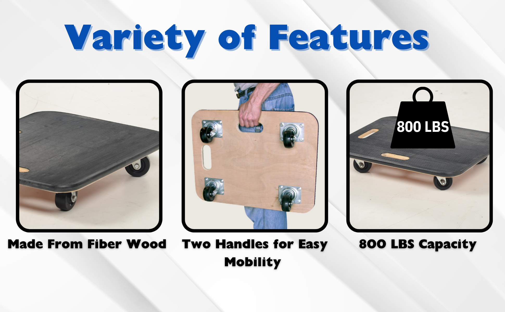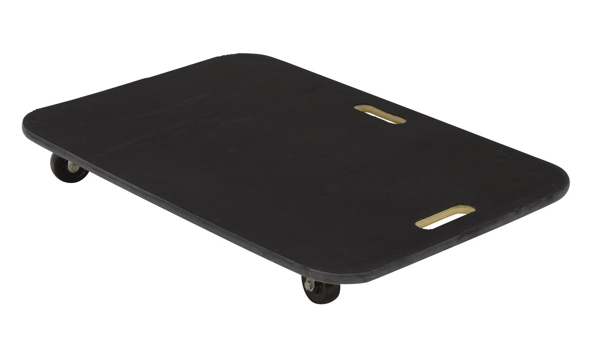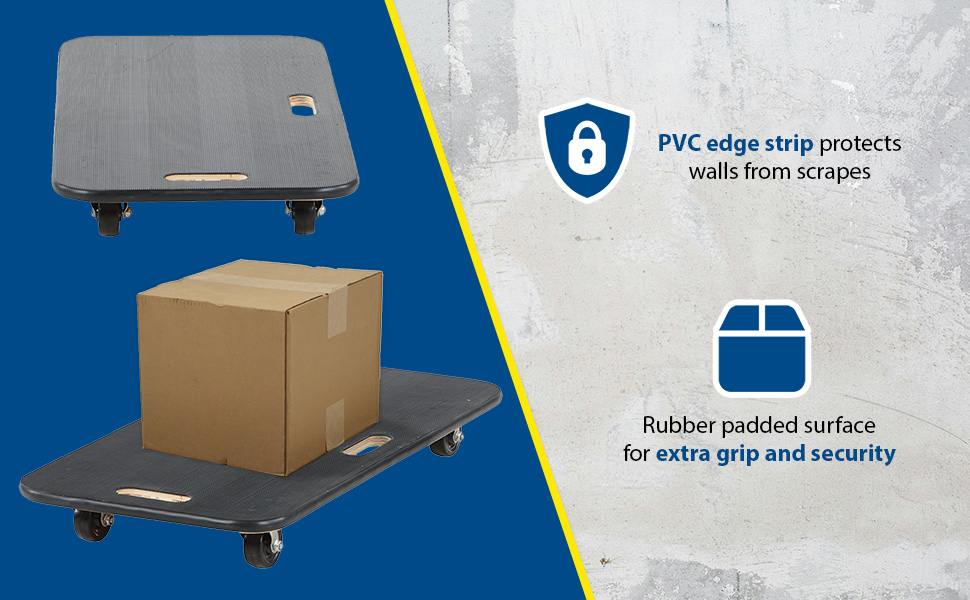 Fiberwood construction dollies feature a rubber padded surface and two hand holes to carry the unit. The PVC edge strip protects walls from scrapes. Units roll on four swivel wheels which are non-marring and oil-resistant. Casters may not be attached for shipping purposes.