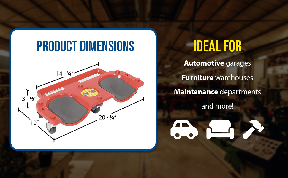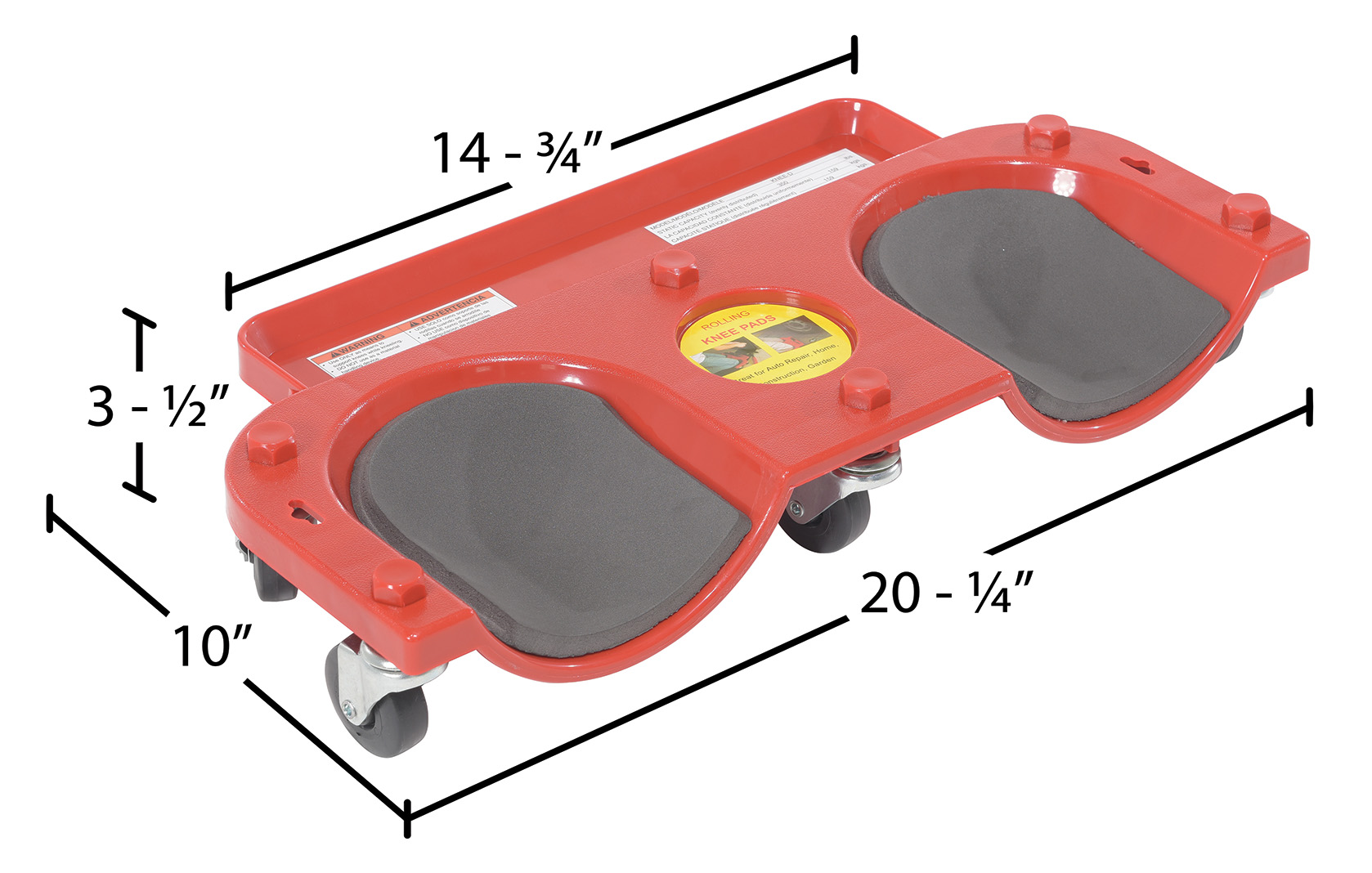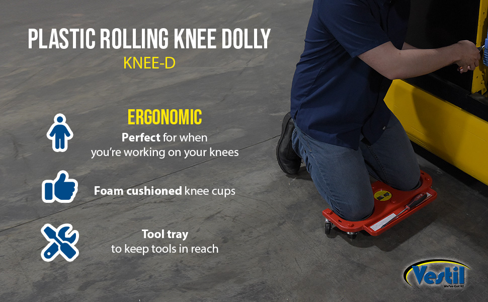 Rolling Knee Dolly, model KNEE-D, is great for people working on their knees. Constructed of red molded plastic with foam cushioned knee cups. Ideal for maintenance departments, automotive garages, and furniture warehouses. Handy tool tray keeps tools in easy reach.
