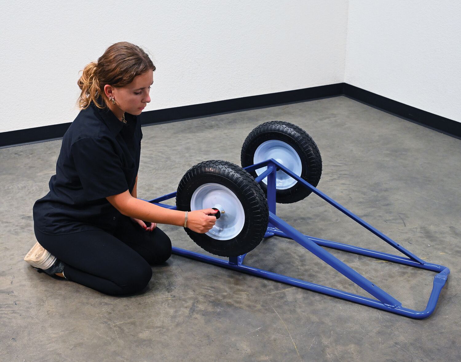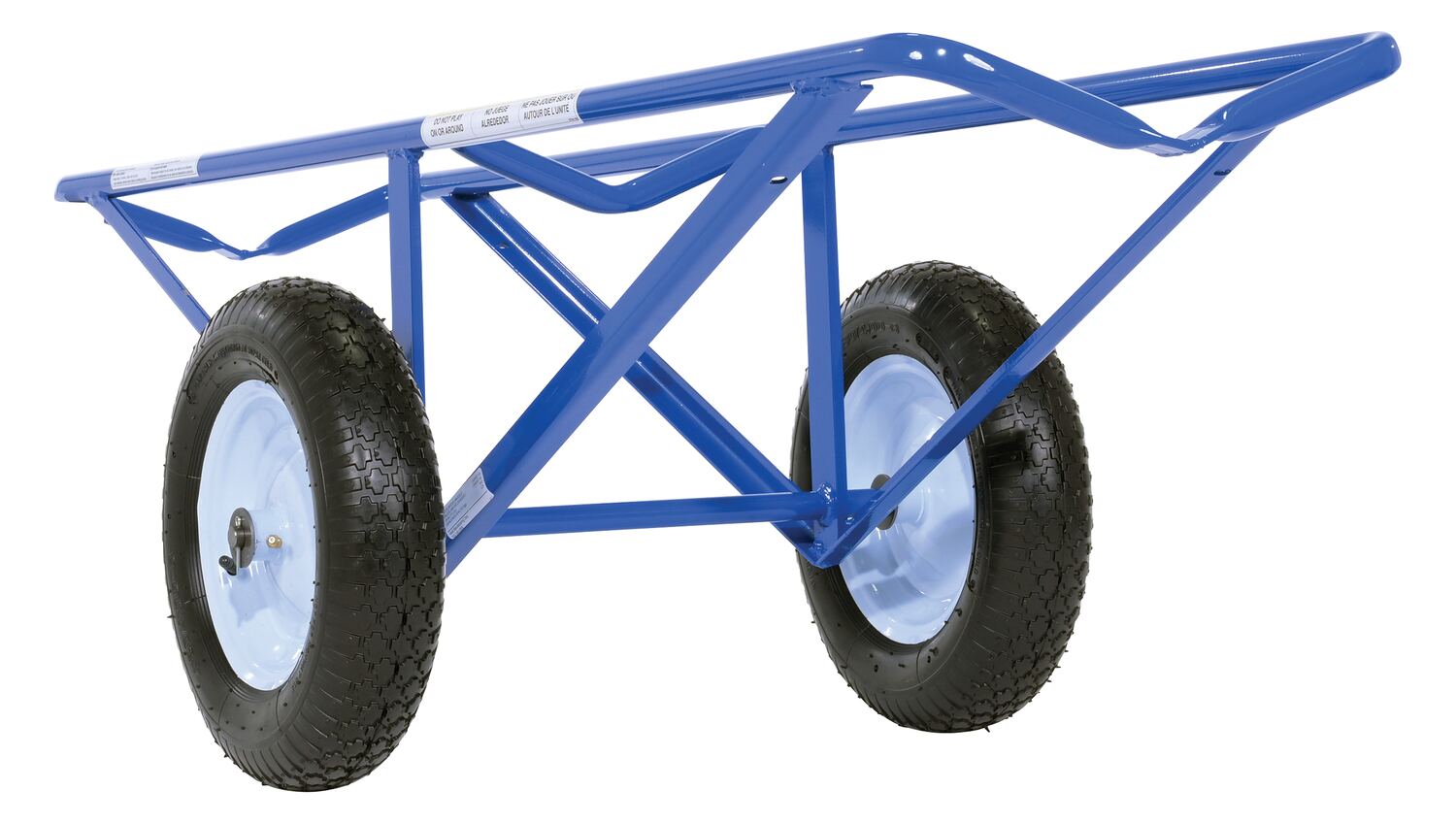 Each unit includes two 16" diameter by 4" wide wheels. Uniform capacity 500 lbs. Welded steel construction with baked in powder coat blue finish.
