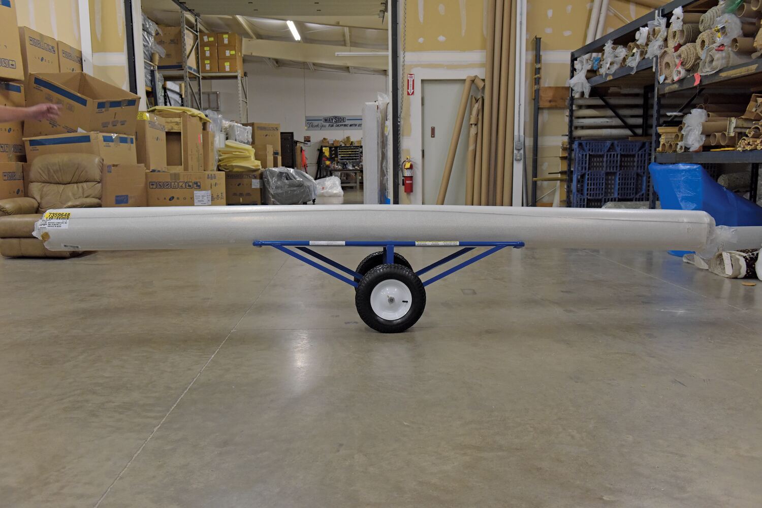 Portable Carpet Dollies allows for easy movement of long and heavy rolls of carpeting. V-groove platform holds carpet rolls securely in place.