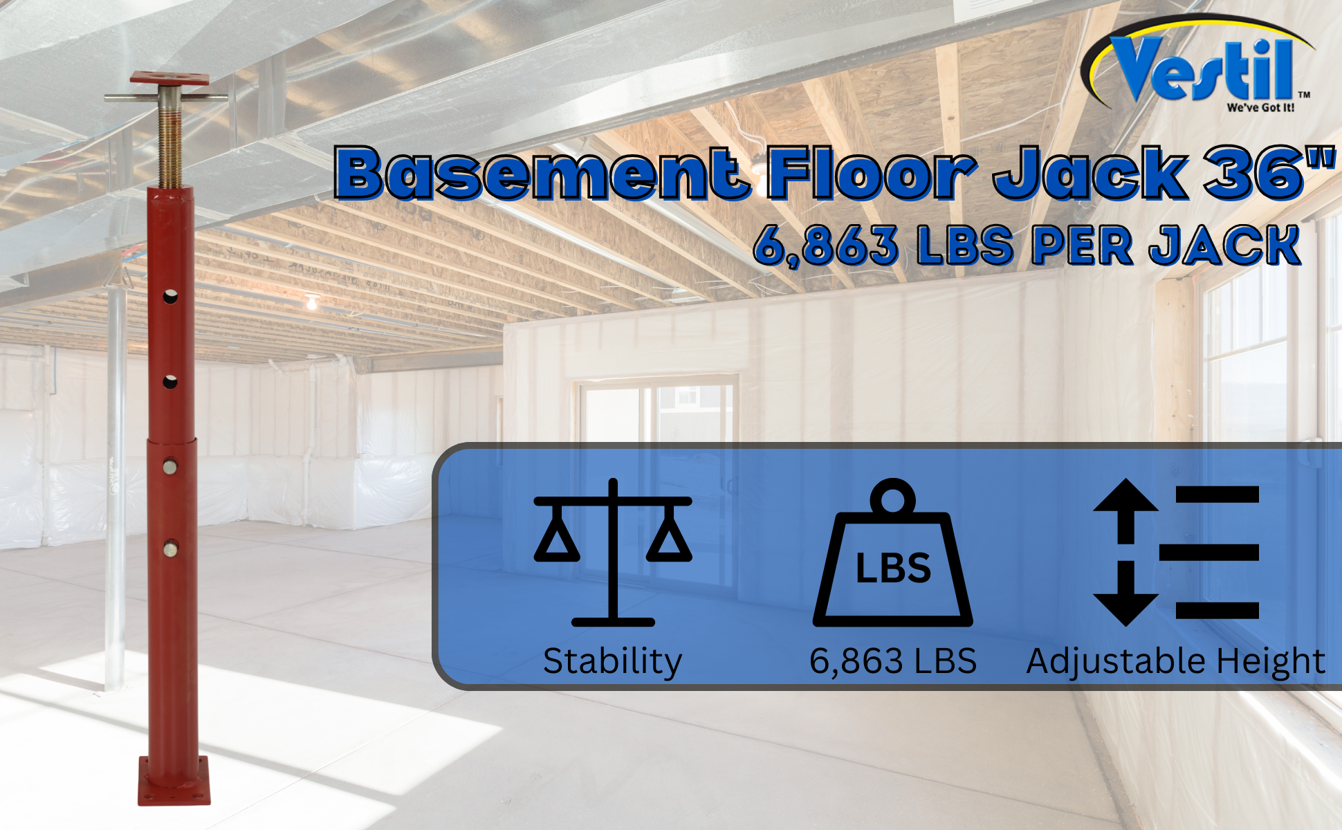 FJB-36 FJB-36Basement Floor Jack 36 In. Maximum Height 6,863 Lb. Capacity RedHeight Minimum/Maximum (in.): 19 to 36
