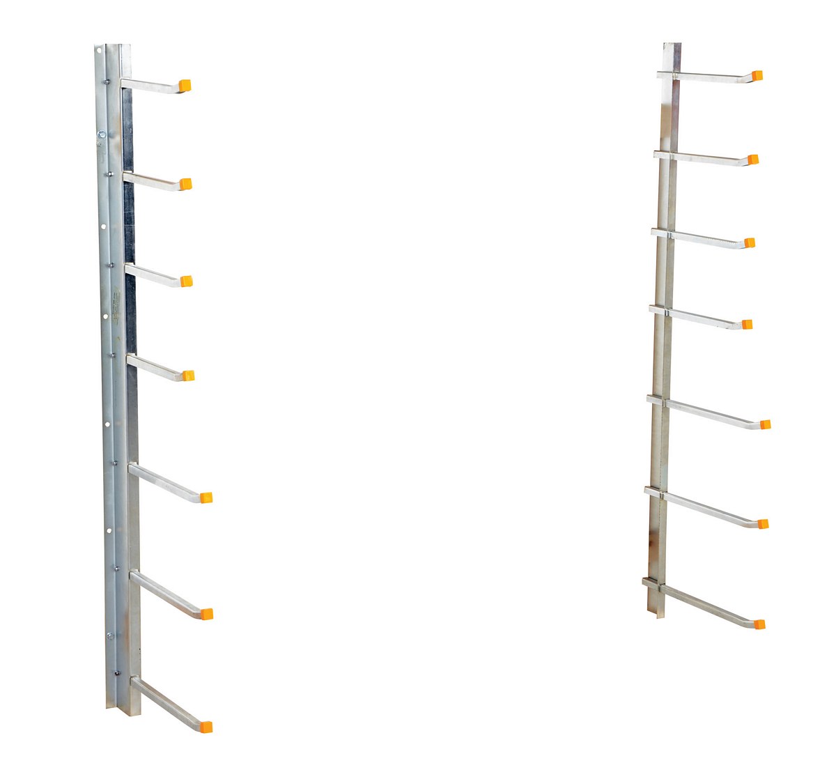 Model SR-WM is a wall mounted unit with dual 60" high supports. They come with three (3) 18" arms and four (4) 15" arms. The 18" arms have 9" height clearance and the 15" arms have 7-1/4" clearance. Uniform load capacity is 1,000 pounds. The bright zinc plating provides a long term, attractive appearance. Shipped knocked down with convenient and quick assembly.