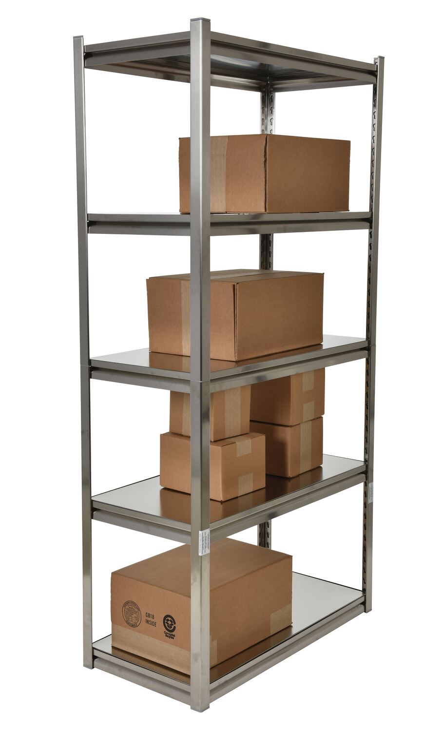 High quality stainless steel solid shelving is made of type 304 stainless steel construction with brushed finish. Each model includes five (5) adjustable shelves with a uniform capacity of 600 lbs. per shelf. The 18 gauge thick shelves are adjustable in 1-1/2" teardrop increments. Two-piece corner posts design includes plastic connectors. Shipped knock-down, easy assembly.