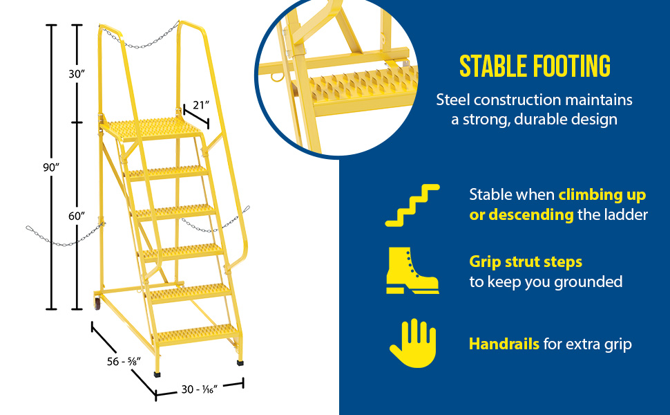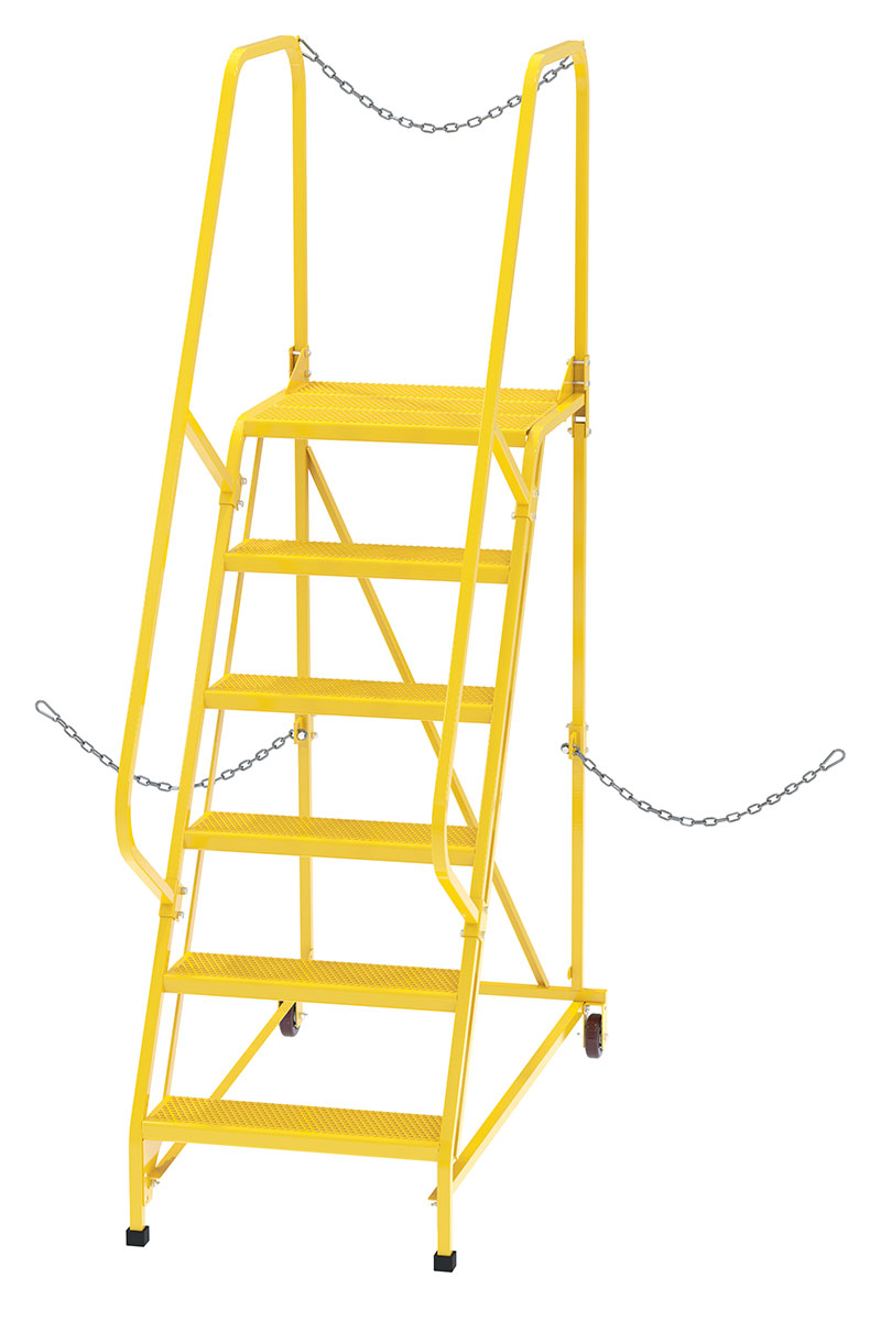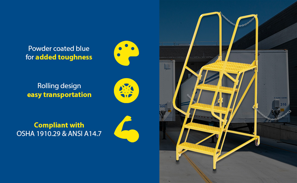 Semi-Trailer Access Ladders are for use getting into Semi-Trailers. Tilt the unit to allow for portability. Units roll on 4" poly-on-poly wheels. Constructed of square tubing framework which handles uniform capacities up to 350 lbs. Features 30" high removable hand railing, access chain, 21" deep top platform, and an industrial baked-in blue powder coat finish for toughness. Each step measures 24" wide by 7" deep and is spaced 10" apart. Climb Angle is 58 degrees. |