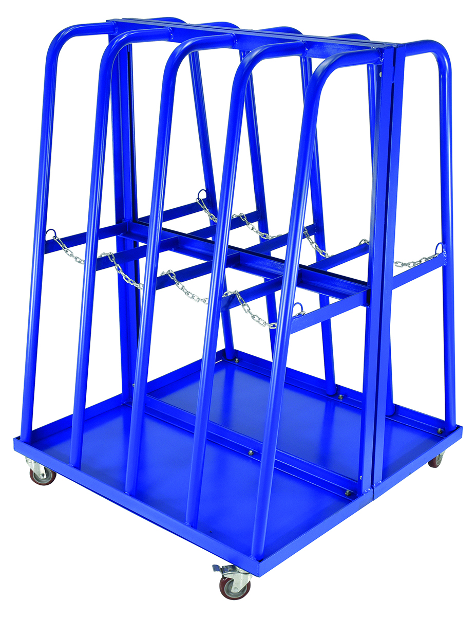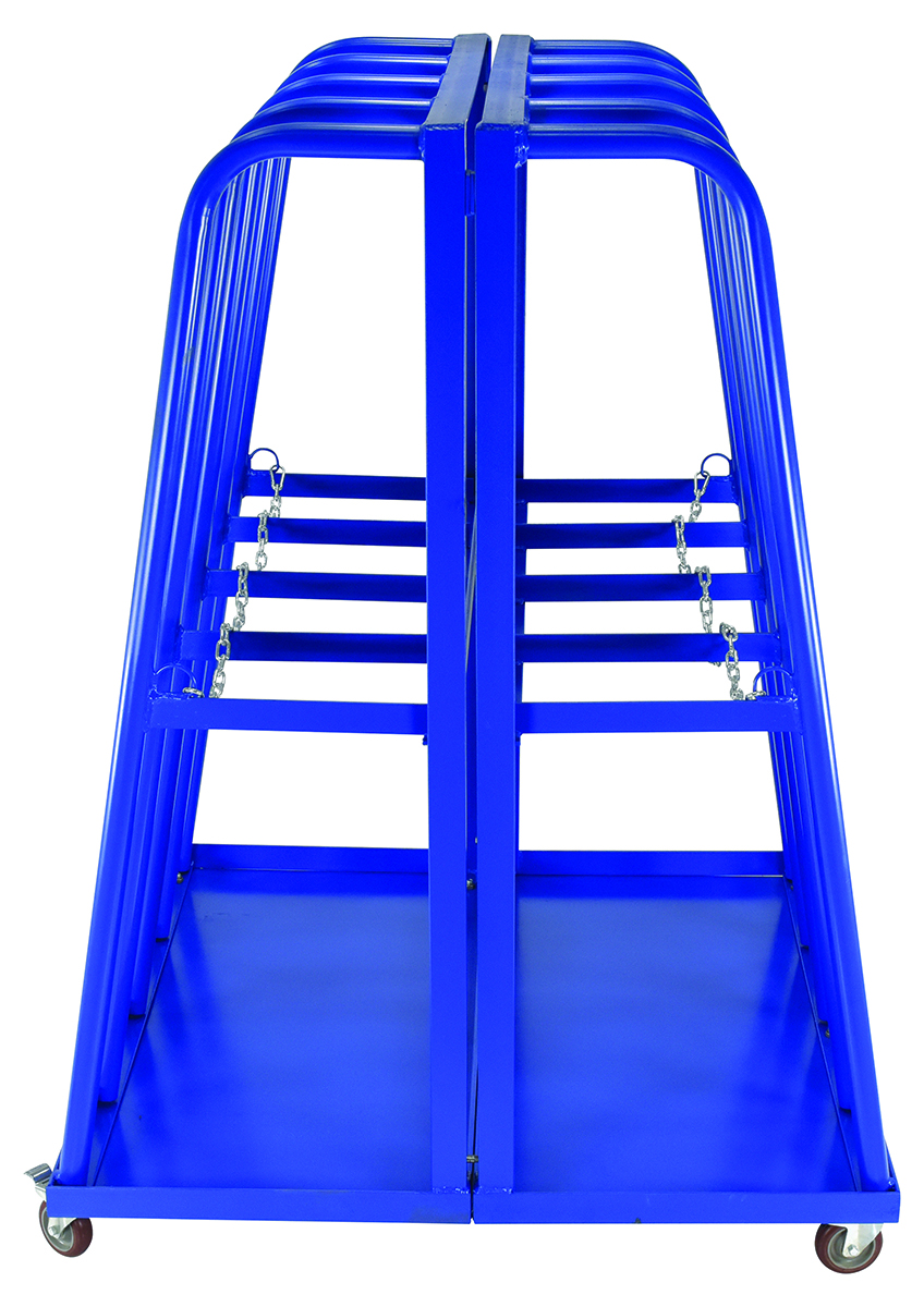 Designed for vertical storage of tubing, pipe, and other types of similar materials. Organize pipes, and extrusions with odd lengths instead of discarding them. Each rack cart has a total of (8) eight bays, (4) four bays on each side. Fully welded steel construction with a baked-in powder coat blue finish for toughness. Maximum material height 10 feet.