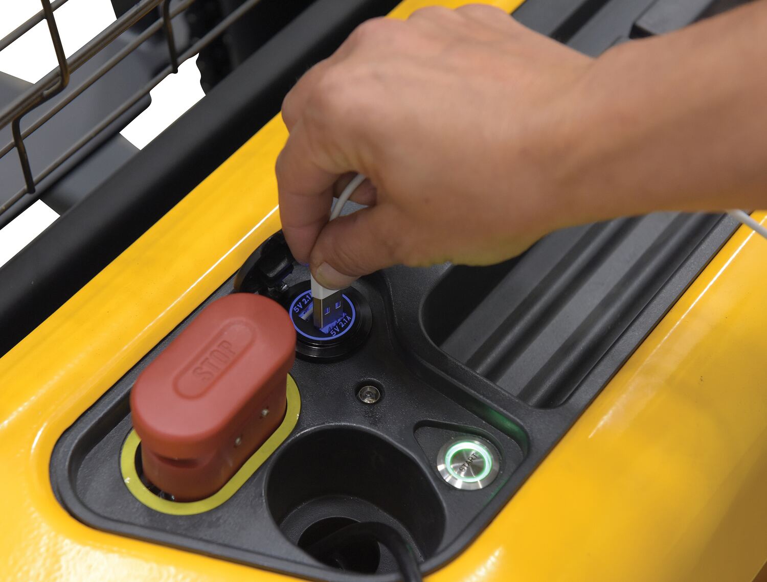 Double Mast Electric Stacker quickly and quietly moves through facilities. Many accessories are included such as speed functionality, forward/reverse knobs, and a battery charge indicator. Powered by a lithium ion battery, the stacker is able to lift the heavy loads often found in manufacturing and shipping facilities. The walk behind design allows the driver to have full control of the steering handle. Forks are adjustable for use with a variety of pallet and products. Hardware included.
