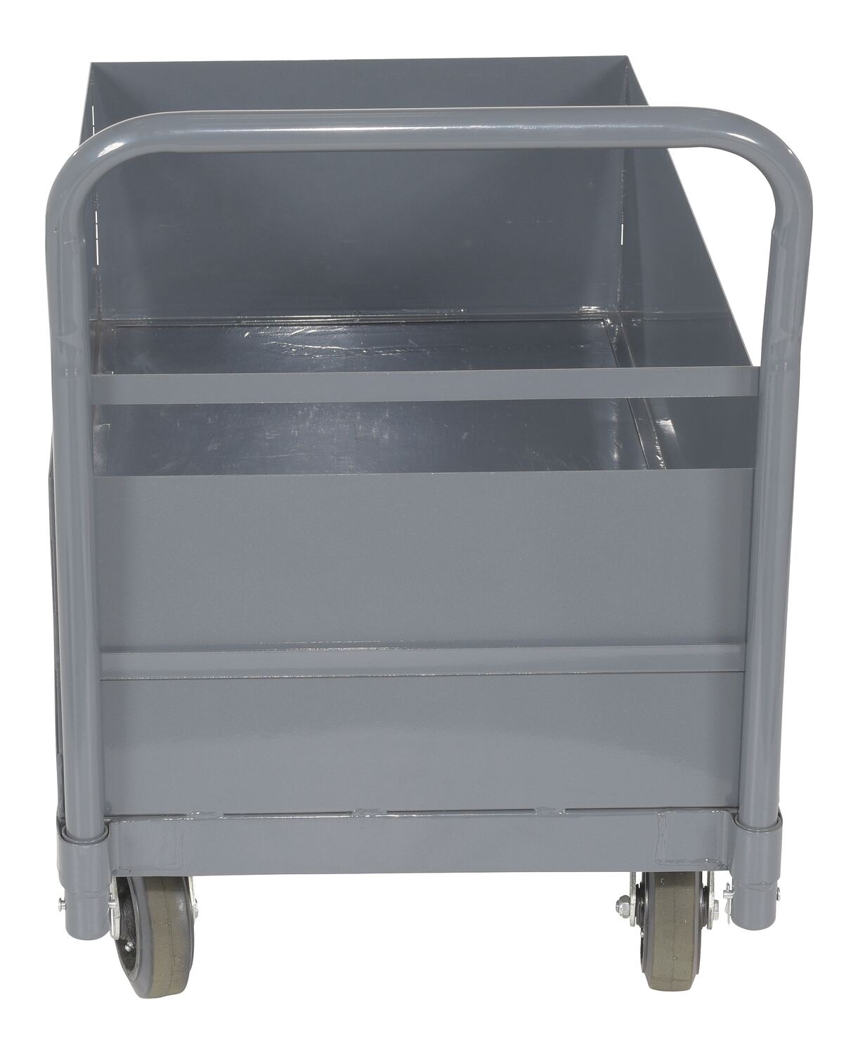 DBPT-2448-12A deep box platform truck fits seamlessly into the warehouse and shipping center truck roster. With uniquely designed sides, the user can maintain a better sense of product security. The all-around smooth surface limits the amount of abrasion and scuffs during movement. An upright handle with rounded corners allows the user to maintain an ergonomic posture while transferring goods. A gray powder coated finish provides added toughness.