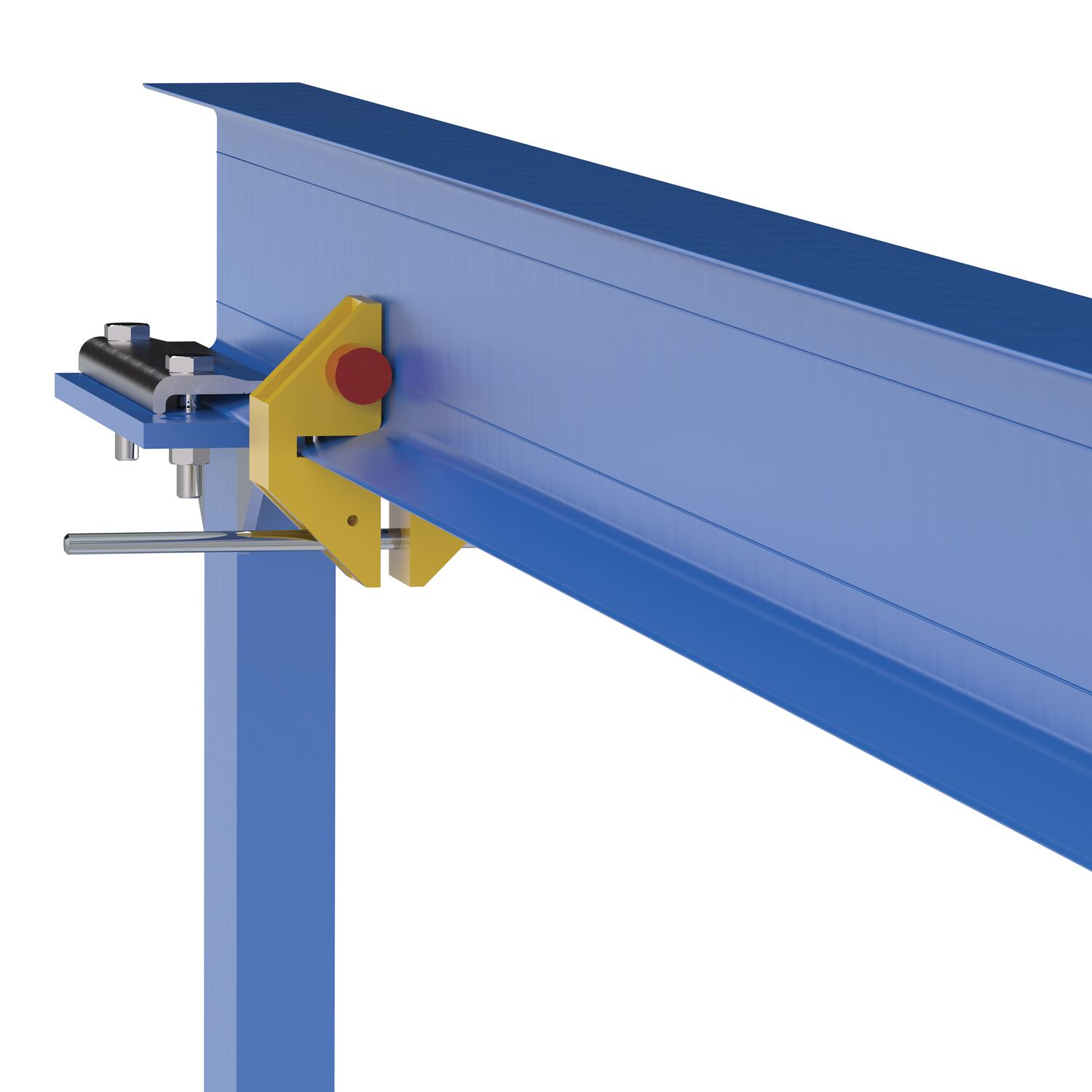 IBSS-3-12An I-beam soft stop prevents trolleys and items from passing through open ends of I-beams. With an adjustable design the stops can be placed at variable positions along the flange of the I-beam, preventing any possible damage. Built of steel, the stops are a worthwhile addition to the workplace, most notably for the safety of personnel. Due to its basic tension driven design, no mounting holes or permanent alterations are needed!