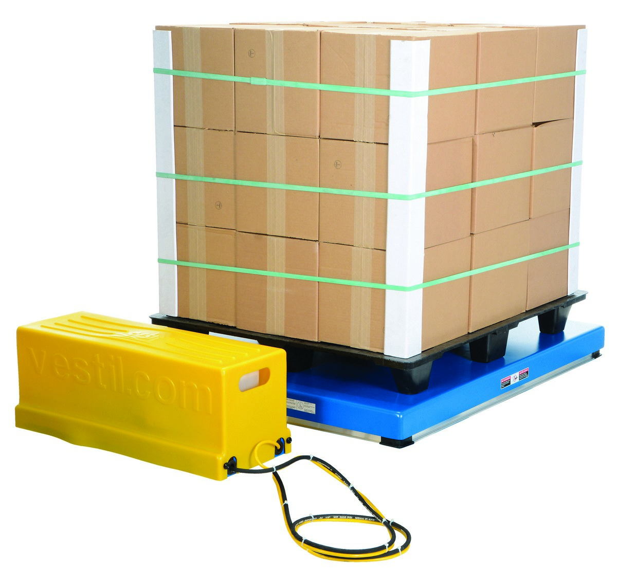 The low profile electric/hydraulic scissor lift table loads and unloads skids with a pallet truck without the need for a pit when using the optional approach ramp. The superior engineering features rugged durability with safety features that include an electric perimeter pinch point guard, emergency stop velocity fuse in cylinders, handheld control and maintenance supports. The remote power unit (32-1/2" x 12" x 12") with 8 foot of hose and cable comes complete with a plastic cover to protect the motor from dust and debris. All standard units are equiped with a 460V, 3-phase power supply.