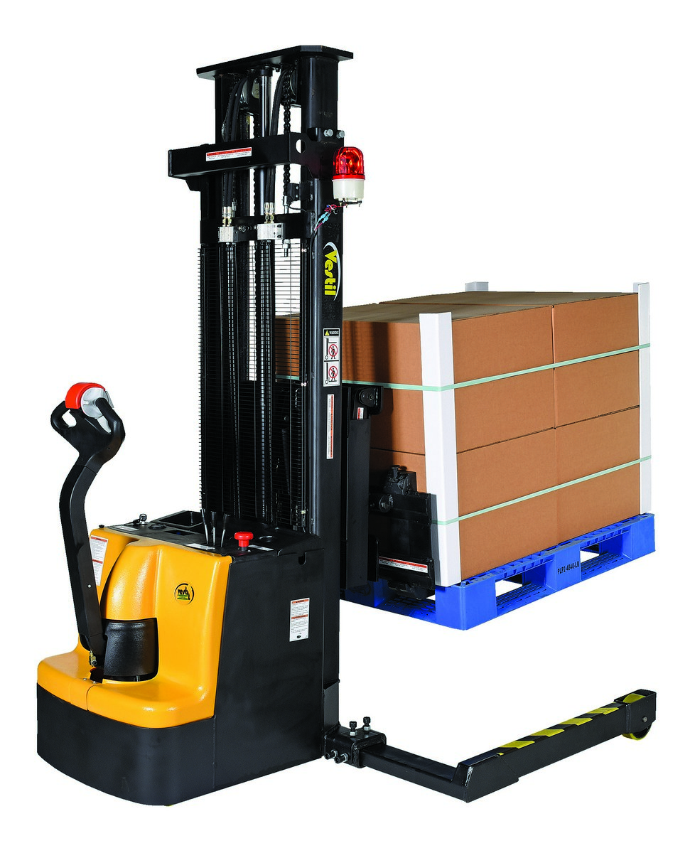 Powered Stacker with Power Drive, Power Lift, and Power Fork Reach is ideal for distribution and shipping facilities. The stacker is equipped with extendable forks, which can be utilized to reach 25" and lift objects in a condensed area where room to maneuver is limited. The stacker is power driven with simple controls that allow for precise positioning of products. Features two (2) 12V batteries with on-board charger. To use, align forks in the desired position and extend the forks to reach the product safely. Once the unit is in place and the product is secured, the stacker can be driven to the preferred workspace.