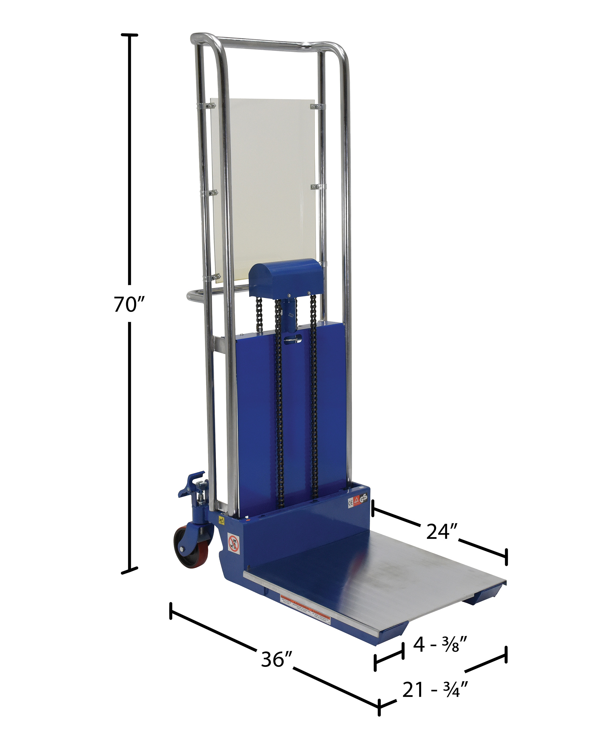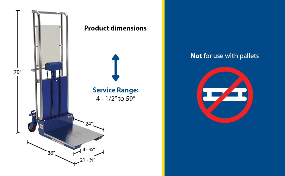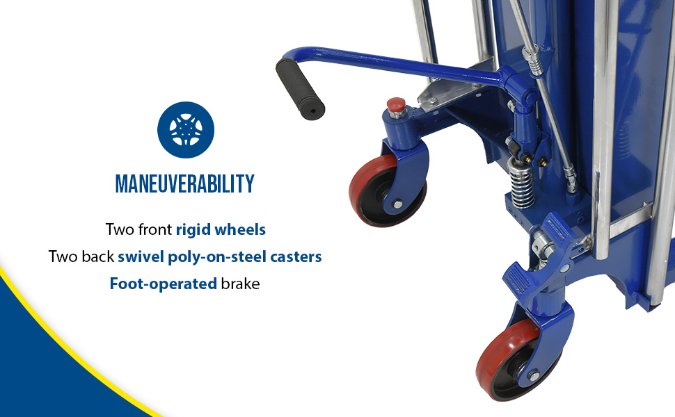 The Hefti-Lift units provide reliable powerful lifting when moving and positioning loads. The manual hydraulic foot pump yields 3/4" of platform travel per stroke, auto-shift models feature a two speed foot pump.The units roll smoothly on two rigid and two swivel poly-on-steel casters with foot operated brake. The units are designed of welded steel construction with chrome platforms and uprights (except model HYD-10-DA-SS) Each fork is 4-1/2"W x 2-1/2"H, the fork length is the same as the platform length. Overall fork width is 22". Not for use with pallets. Stainless Steel units are compact, lightweight, and capable of turning in a small radius when space is limited. A built-in automatic load check valve is included for improved safety. Model HYD-5-SS features a hydraulic foot pump, while model HYD-10-DA-SS comes with a dual acting manual hydraulic hand pump.