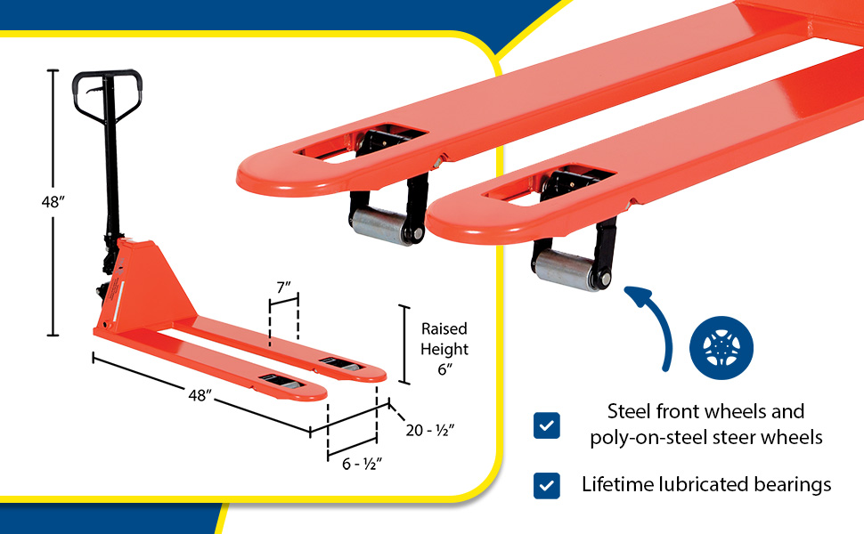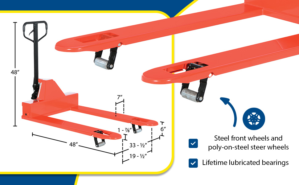 The Low Profile Pallet Truck enters pallets from all four sides. All steel frame is reinforced to handle 4,000 lb. capacity loads. Individual fork width is 7" wide. Wide loop control handle with lift, neutral, and lower functions provides fingertip control. Lifetime lubricated bearings. Hydraulic system has hard chrome plated pump piston with polyurethane seals. Suspension system has a heavy-duty thrust bearing. Complete with adjustable push rods, polyurethane wheels, steel load rollers and red baked-in powder-coated toughness.