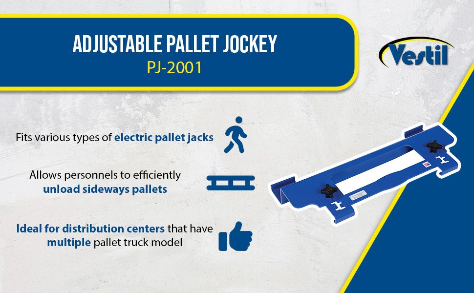 The Non-Adjustable (PJ-1005) unit is ideal for warehouse distribution centers that have one particular electric pallet truck model. To use, simply place the Pallet Jockey hooks into the fork wheel openings. Fits popular sizes of walkie trucks (verify your fork width and end of fork dimensions) and our electric pallet truck, model EPT-2547-30.