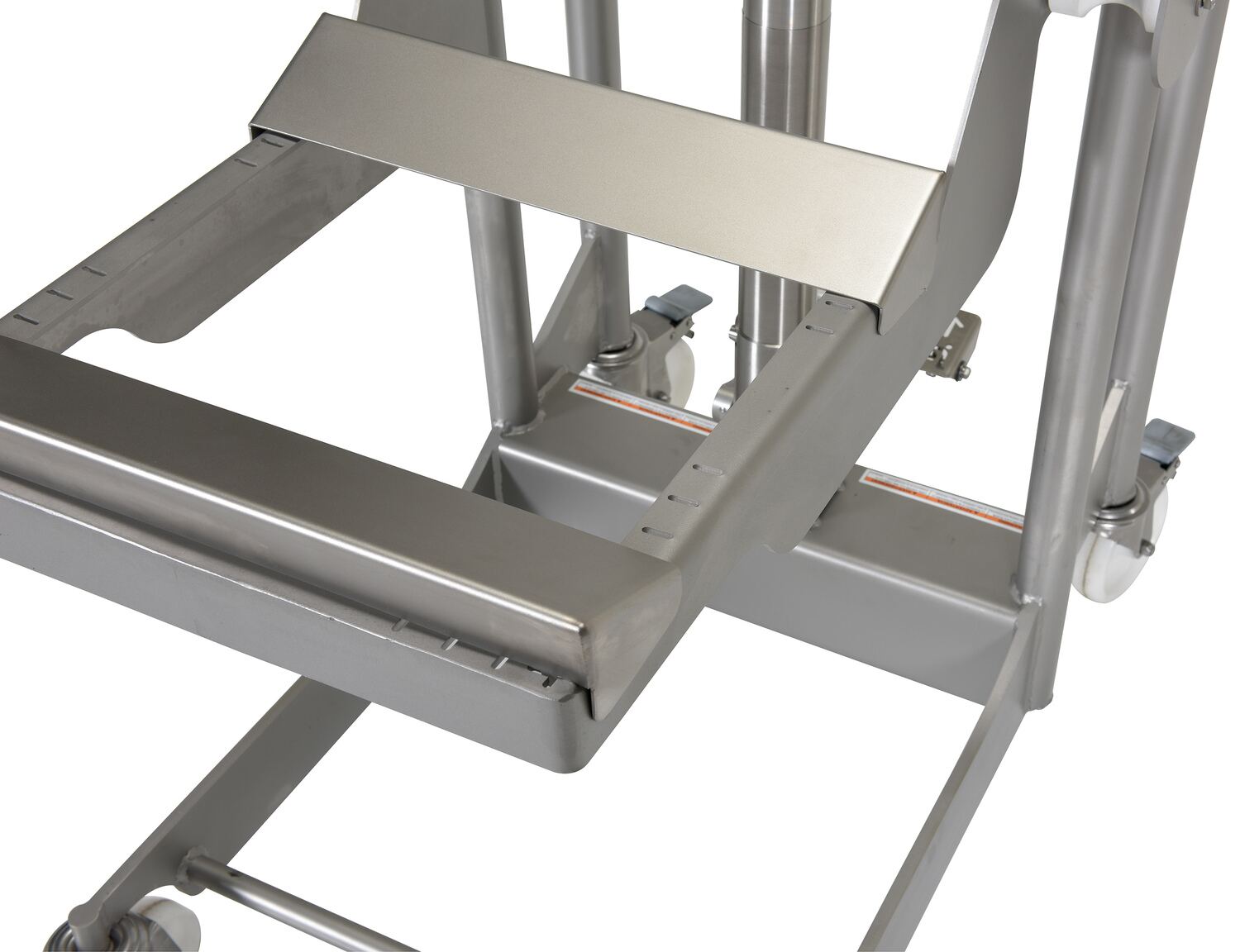 A 304 Stainless Steel Hydraulic Foot Pump Roll Handler is great for an assortment of areas including the food handling service industries. The design is sleek, smooth, and easily washable for before and after use in hygienic areas. The raising and lowering of the platform to the precise position is made easy by the hydraulic foot pump design, which diminishes needless bending when loading/unloading material. The 304L stainless steel construction including hydraulic cylinders as well as the piston provides a strong structure for transferring heavy loads between work areas. A rounded handle style allows for a proper two handed grip when maneuvering around work areas, while the perfect open cradle platform lets the user load material from three sides. Cradle adjusts in 1" increments up to 16" wide. The handler rolls smoothly on four swivel casters with two attached rear brakes for safe functionality when in a resting position.