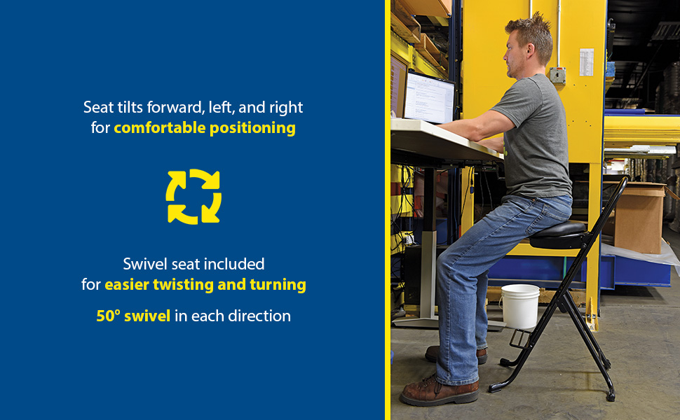 Ideal for any industrial environment. The CPRO-600, CPRO-600S, CPRO-200, and CPRO-100 models are adjustable in 2" increments from a low crouch to a standing position with the simple cross bar attachment design. The units are constructed with four rubber "shocks" under the seat base which allows the seat to tilt forward, left, and right so it can accommodate our body movements and a more natural posture position. Additionally the CPRO-600S model features a swivel seat for added maneuverability, while, the CPRO-100 includes casters for portability from work station to work station.