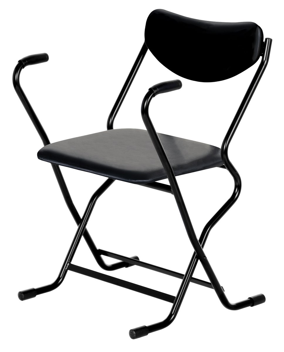 The folding arm chair is ideal for a variety of industrial environments. The lightweight steel construction with a powder coat finish is durable and easily moved from area to area. The unique folding design features an integral arm support system that offers assistance while transitioning from a sitting to standing position. To fold, simply push the front of the seat up and back, while the unit collapses onto itself. The unit includes vinyl cushioning for comfort, plastic caps on the steel legs to protect against floor damage, and is self-standing when folded for areas of limited storage space. Color is black.
