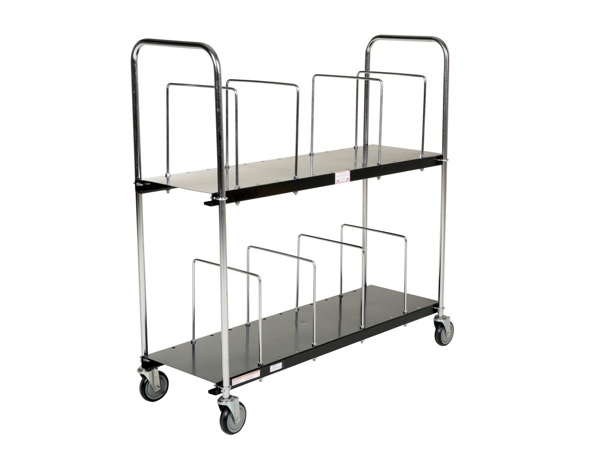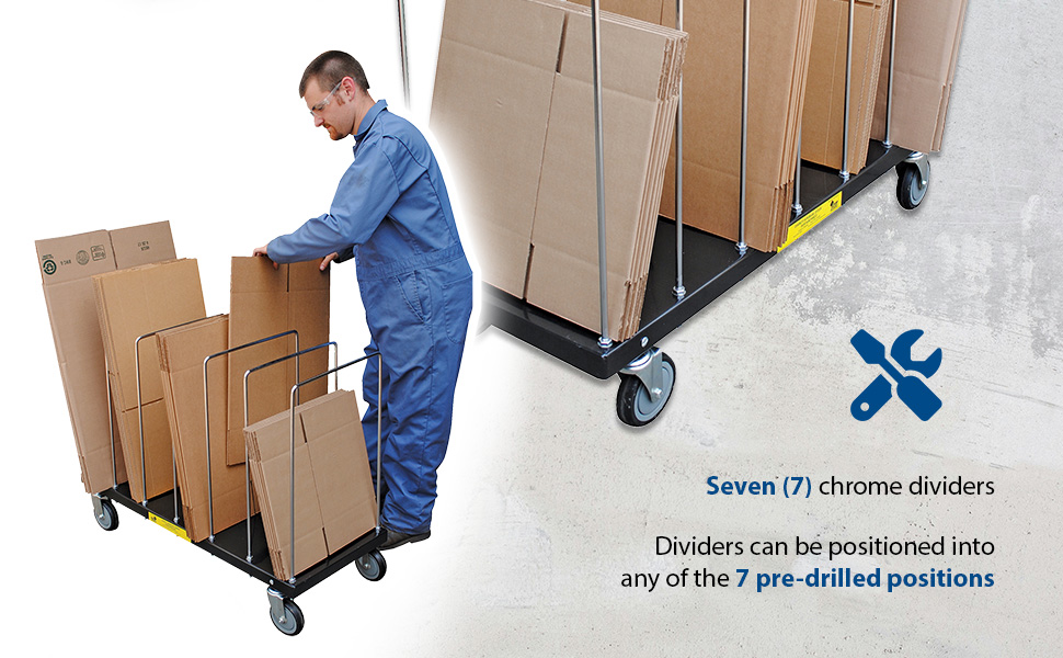 Model CTPT-1844-CK features one shelf with adjustable box dividers ideal for oversized boxes. The seven dividers can be positioned along the cart deck in any of seven (7) pre-drilled positions.