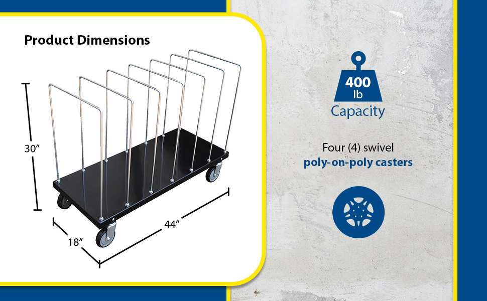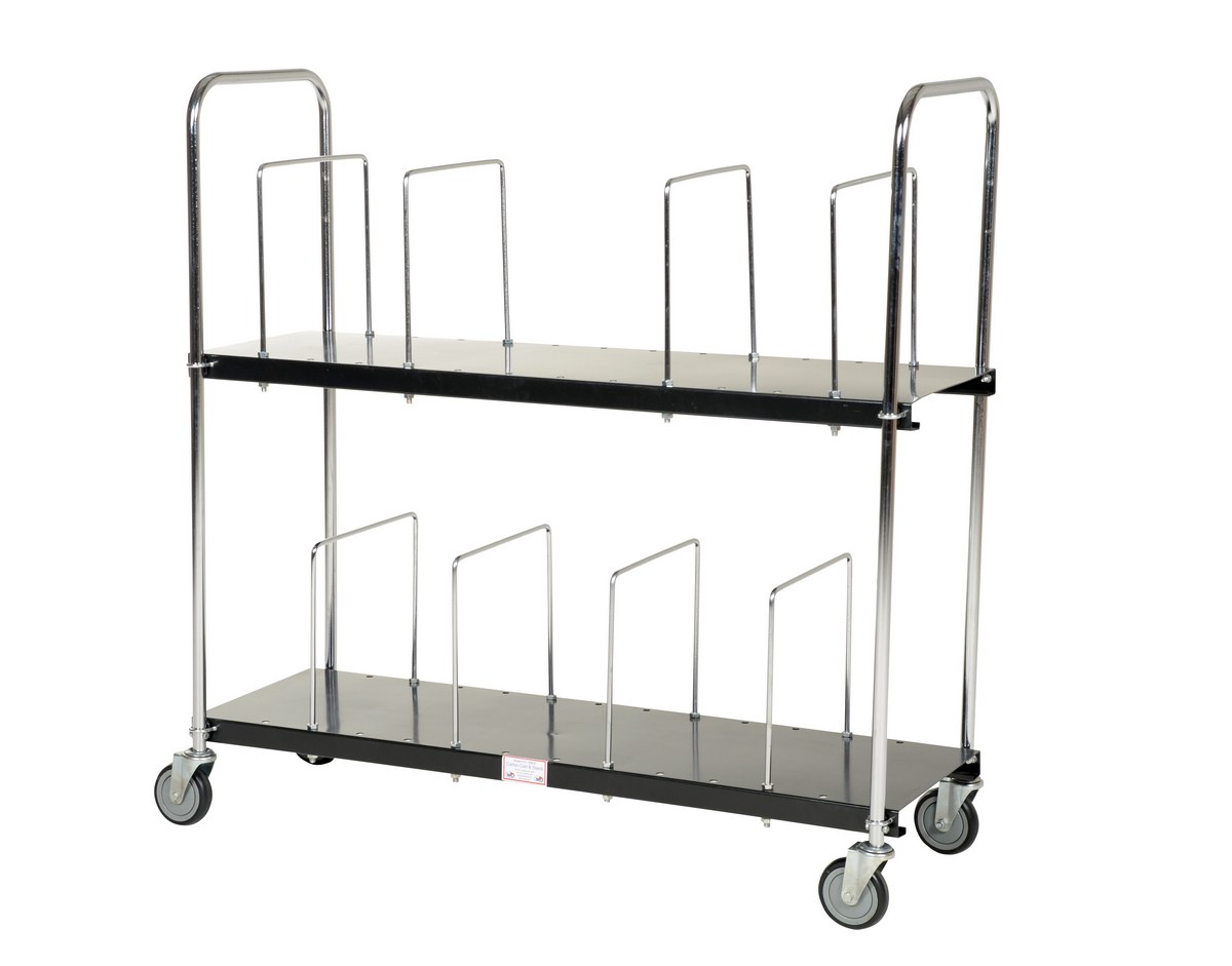 Portable steel cart is designed to store, organize, and transport your empty cardboard boxes. Chrome plated uprights and frame dividers with powder coated black shelves. Uniform capacity is 400 pounds. Four 5" x 1-1/4" poly-on-poly casters swivel casters for easy maneuverability are standard. Ships knockdown.