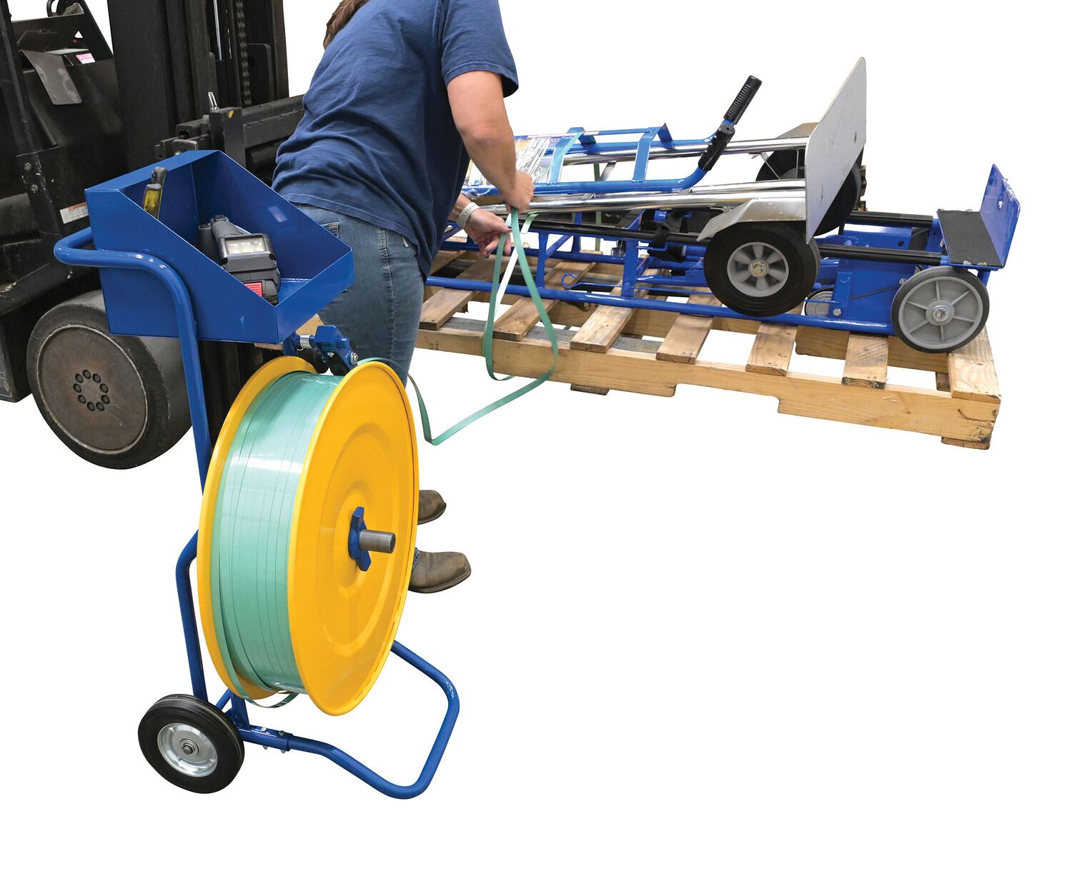 Universal strapping carts are designed for use with Poly and Steel strapping. STRAP-PS-HD features unique multi-tier discs for use with strapping core sizes of 16" x 3", 16" x 6" and 8" x 8". Cart includes storage tray and two (2) 8" x 2" hard rubber wheels for easy portability. Powder coat finish. See our Steel Strapping or Poly Strapping available. STRAP-PS-P is a lightweight strapping cart with plastic disc and integral tool tray. Designed for use with poly strapping that has a core size of 8" x 8" see here. Great for everyday use around the warehouse, including box sealing and bundle applications. Two (2) 8" x 2" plastic wheels for easy maneuvering.