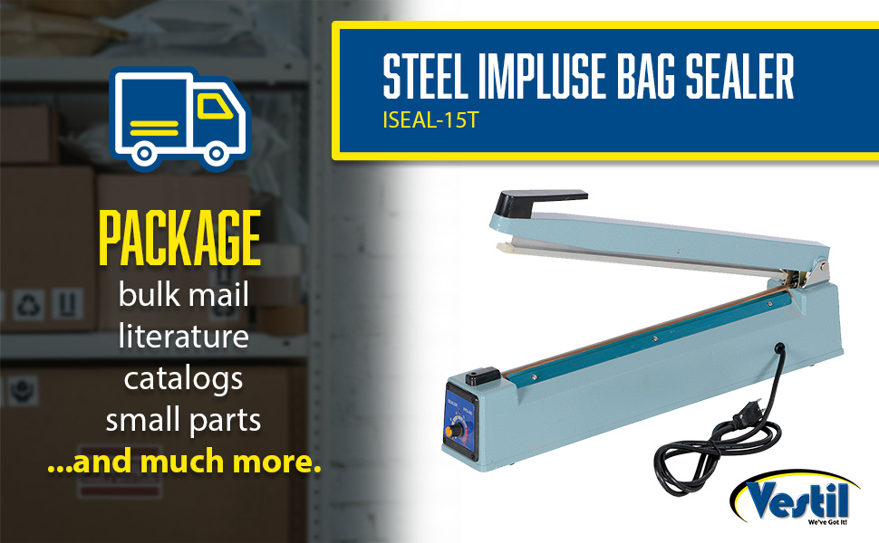 This lightweight table top Impulse Bag Sealer is ideal for packaging bulk mail, literature, catalogs or small parts. Easy to operate. A heat weld closes each bag tight.110V, single phase with cord and plug. Poly bags are not included.