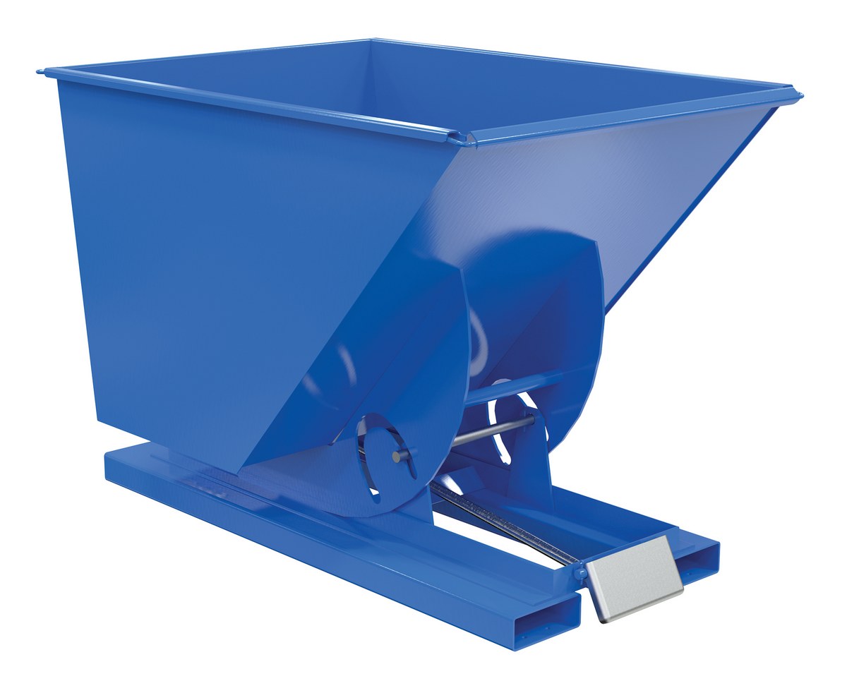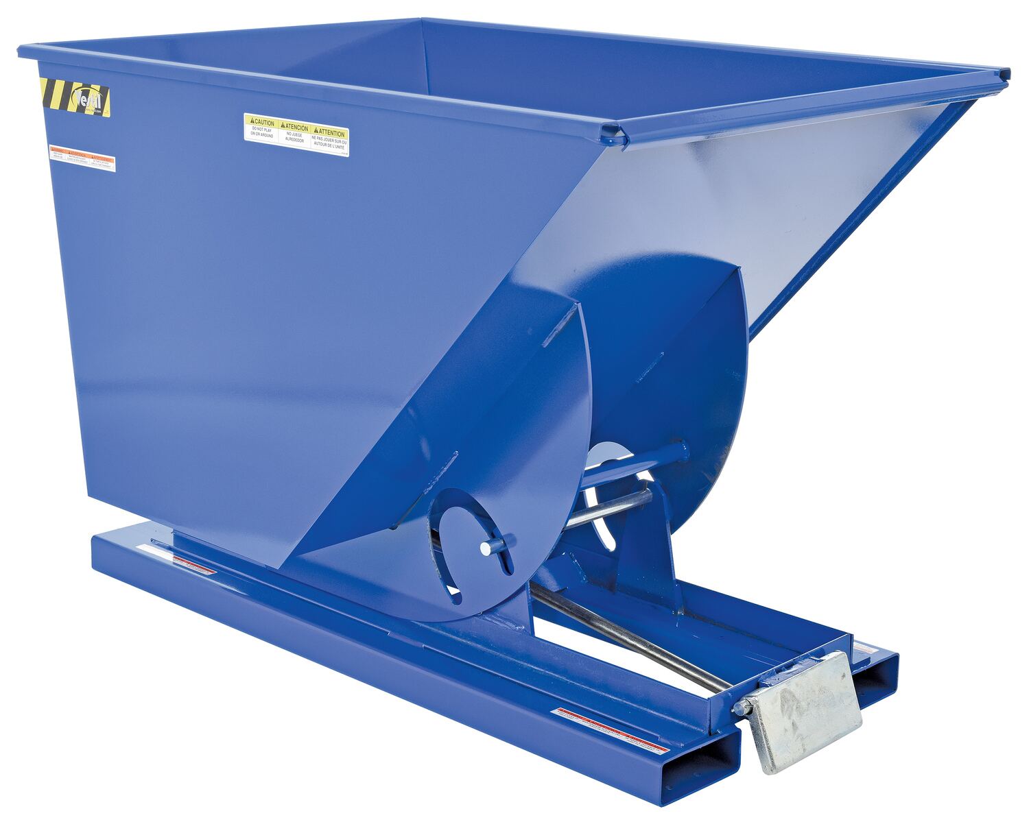 Hopper automatically dumps when bumper release contacts the front of the dumpster. Hopper returns to an upright and locked position automatically after it dumps. Also includes a cable that may be operated from the seat of the fork truck to manually dump the hopper. A safety restraint is provided to secure the hopper to the fork truck. Usable fork pockets are 7-1/2"W x 2-1/2"H. Self-dumping hoppers facilitate compliance with OSHA General Industry rule 29 CFR 1910.178(m)(5)(iii) by allowing lift truck operators to remain at the controls of their truck throughout the dumping process. Optional leak proof design sold separately. D-25, D-33, D-50, D-75, and D-100 are stackable if you stack the top hopper turned 90 degrees from the bottom. Blue baked-in powder-coated toughness is standard.
