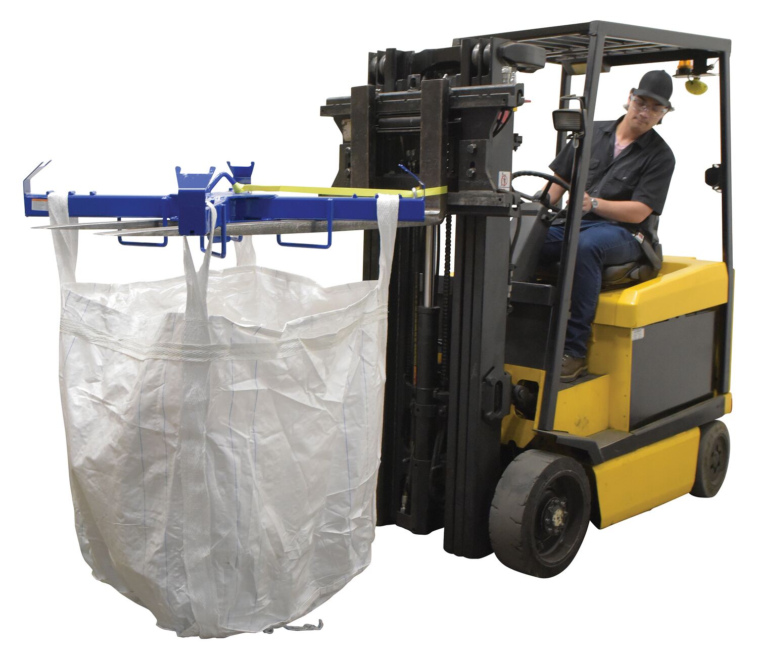The bag lifter is ideal for industrial and manufacturing settings. The unit is constructed of powder coated steel for durability and added strength. The lifter can be used with the center mounted hook point for balanced lifting capabilities with an overhead hoist or with a forklift by utilizing the attached fork pockets (retaining strap included). After choosing which lifting style is best, secure the loops of the bag to the four strap points for safe maneuvering and transporting.