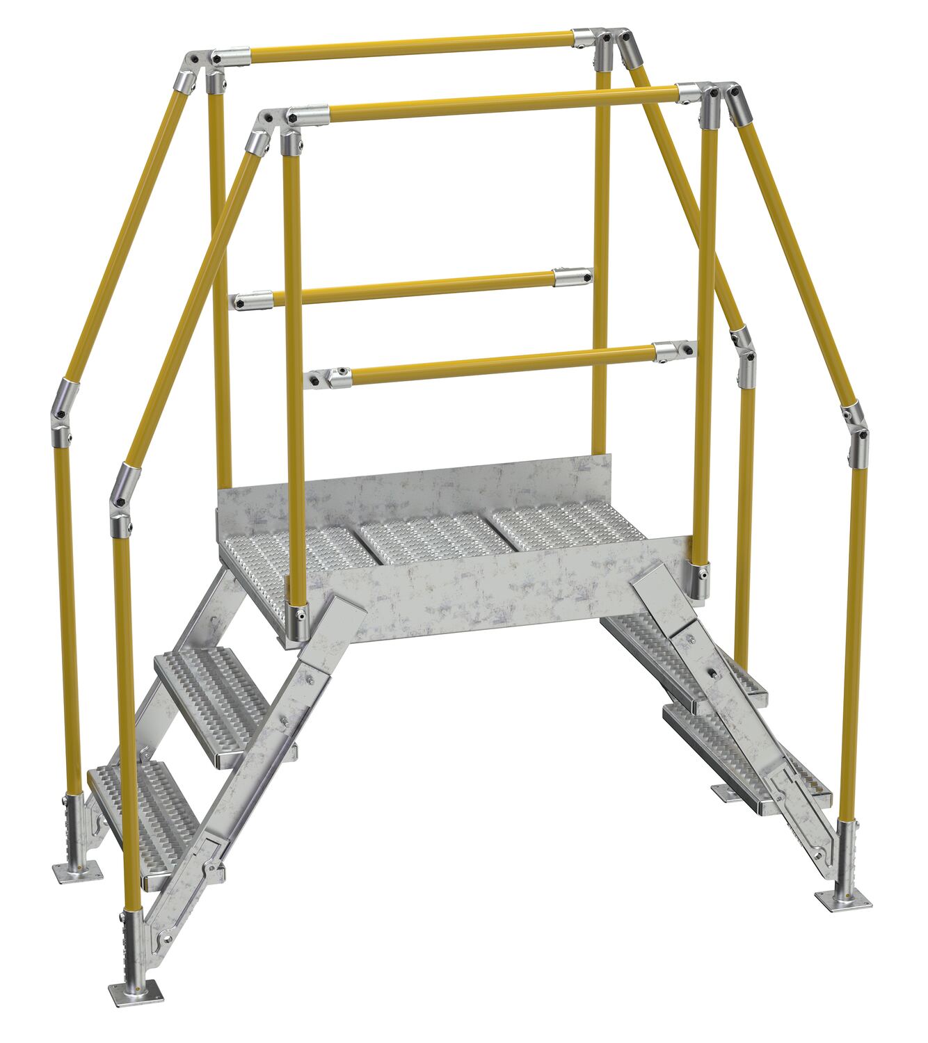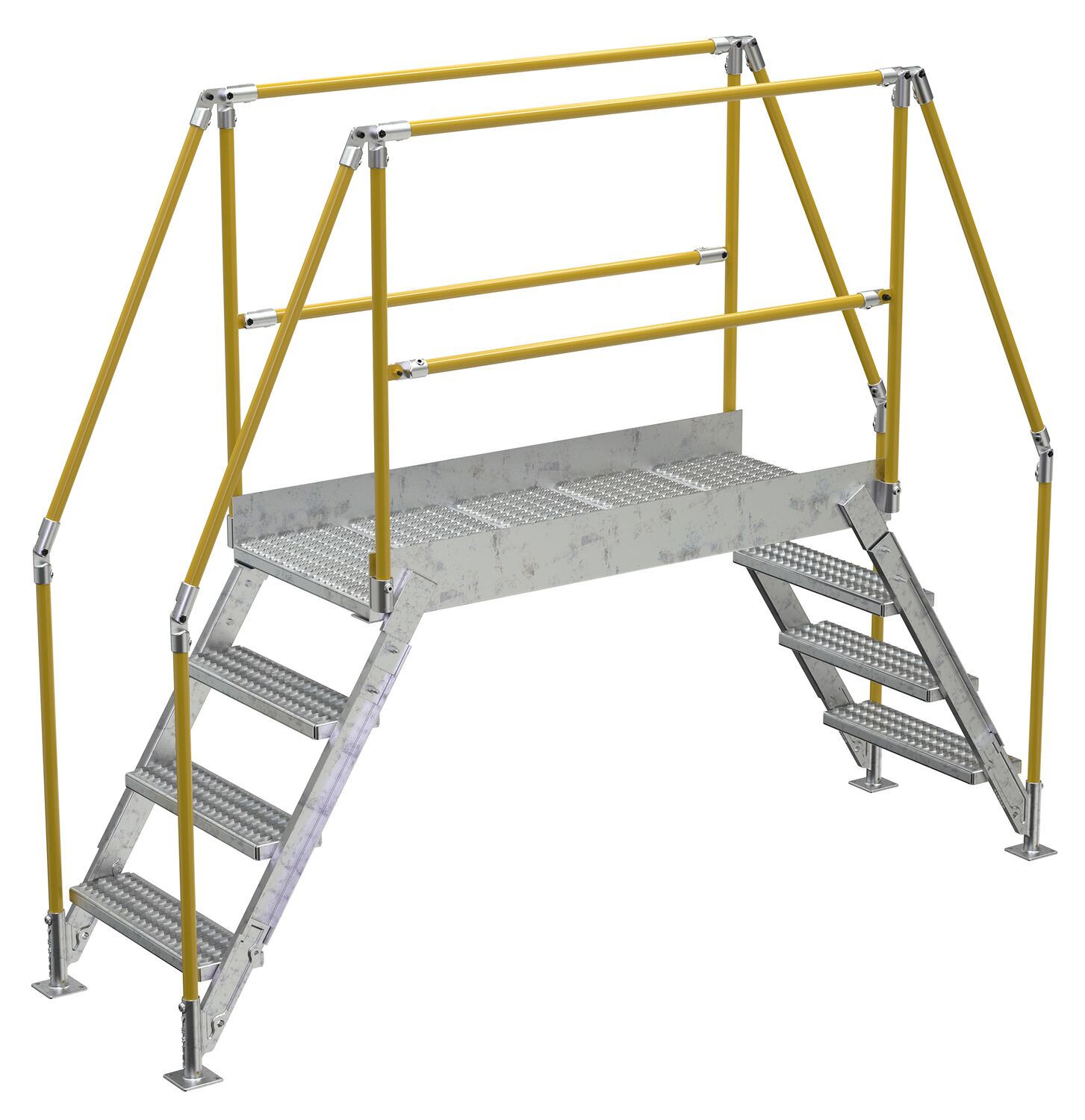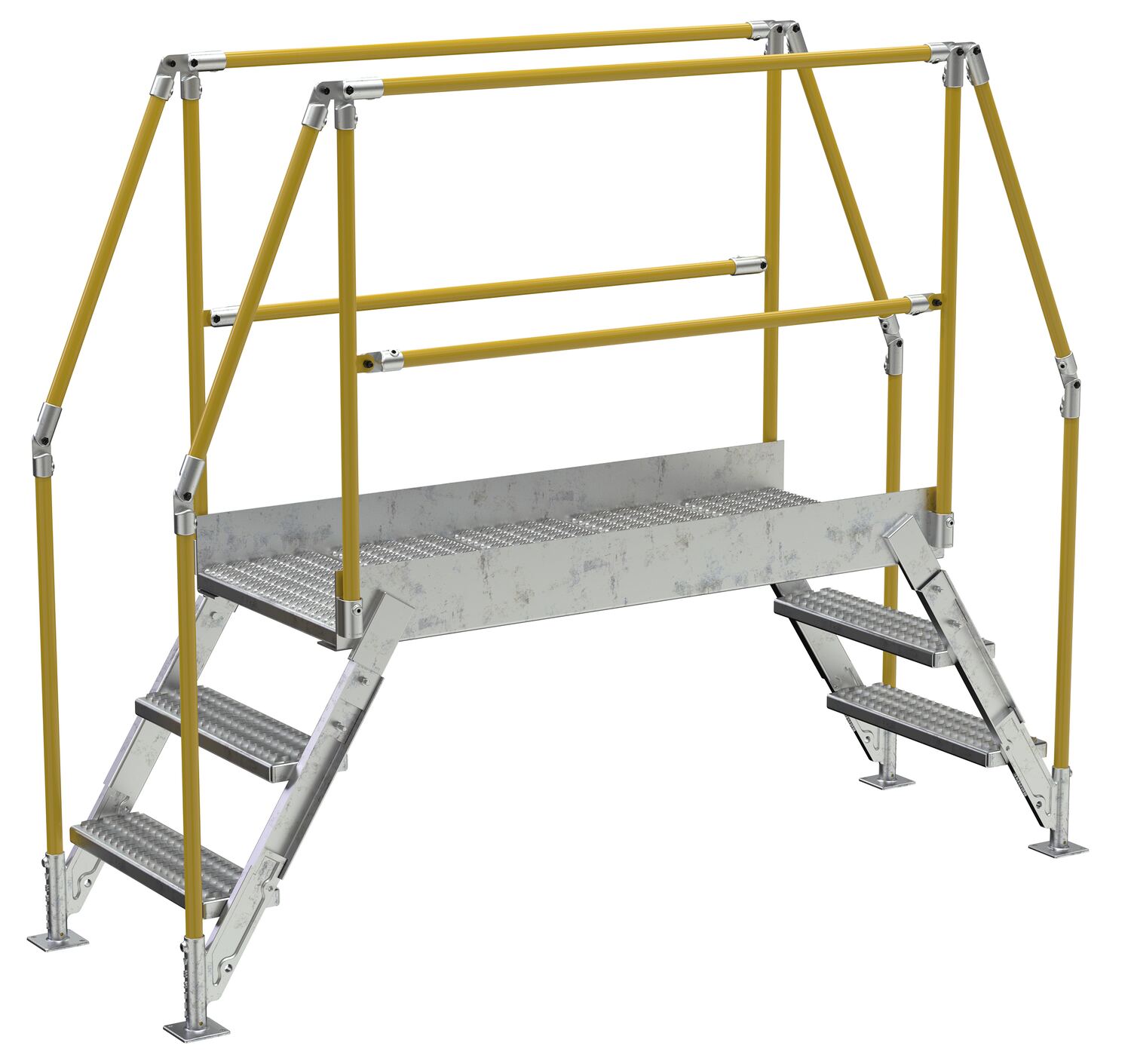 In crowded industrial settings, sometimes the best way around an obstruction is up and over. Utilizing a crossover ladder allows the permanent pieces in the work area to stay in place, while providing a more efficient option for personnel. The horizontal platform includes both upper and lower rails for complete staff security. Ground legs include floor mounting pads and units must be anchored to the surface. During times of temporary use, the ladder can be uninstalled and 'knocked-down' for storage and shipping. Handrails have a safety yellow powder coat finish. Steps and platform have a durable hot dip galvanize finish.