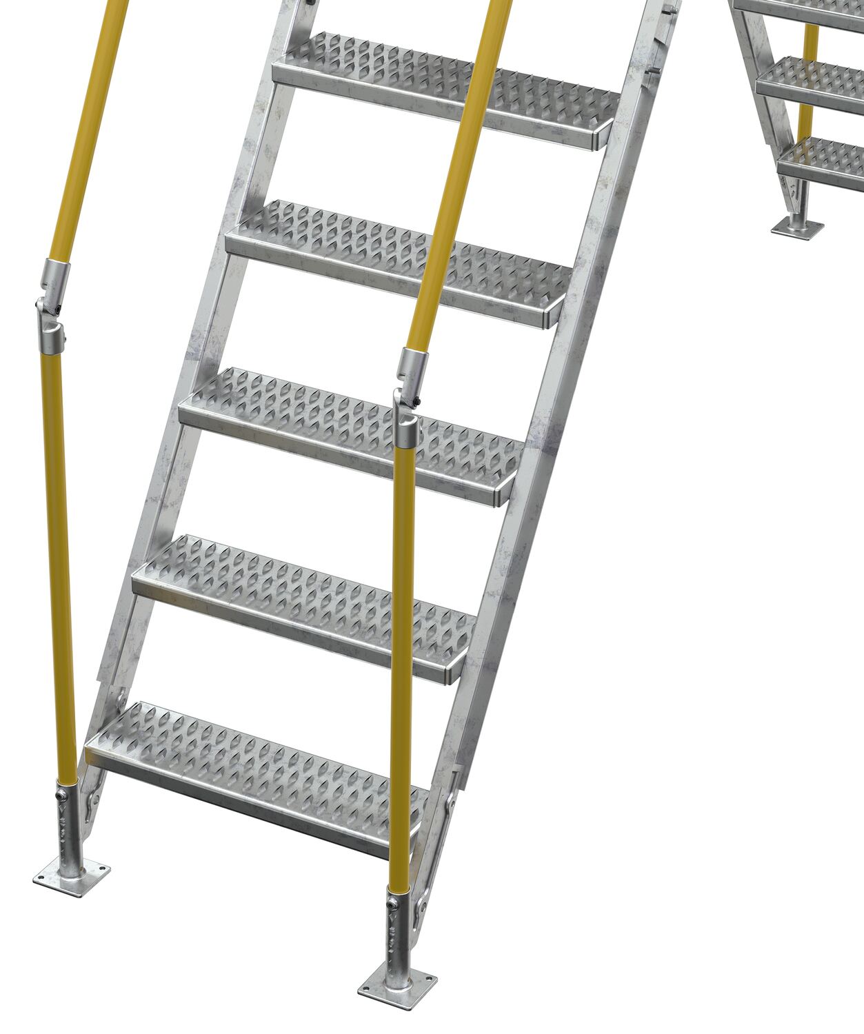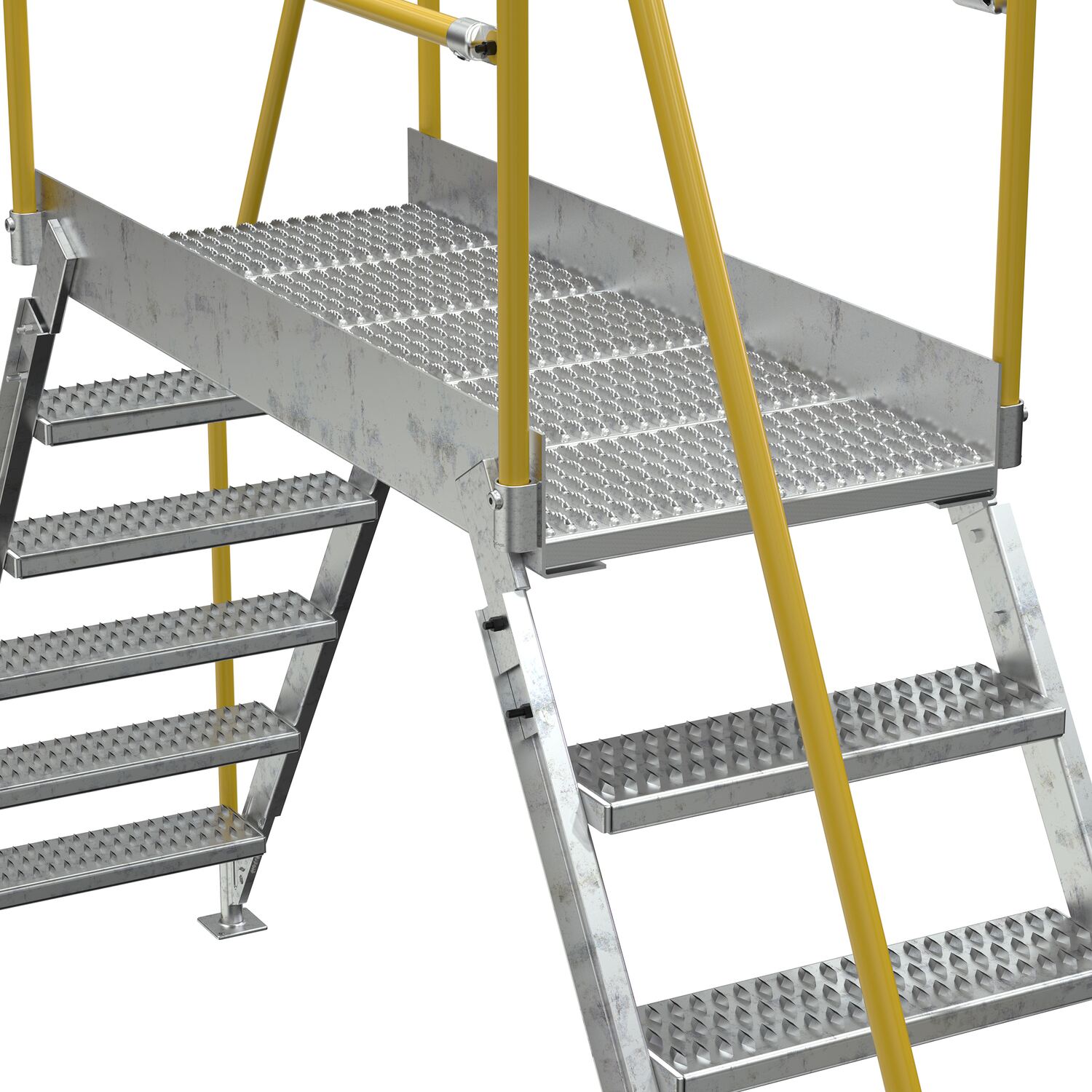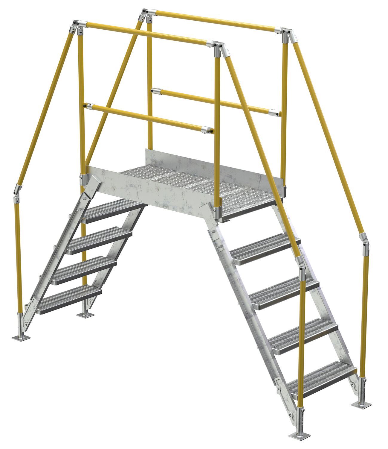 In crowded industrial settings, sometimes the best way around an obstruction is up and over. Utilizing a crossover ladder allows the permanent pieces in the work area to stay in place, while providing a more efficient option for personnel. The horizontal platform includes both upper and lower rails for complete staff security. Ground legs include floor mounting pads and units must be anchored to the surface. During times of temporary use, the ladder can be uninstalled and 'knocked-down' for storage and shipping. Handrails have a safety yellow powder coat finish. Steps and platform have a durable hot dip galvanize finish.