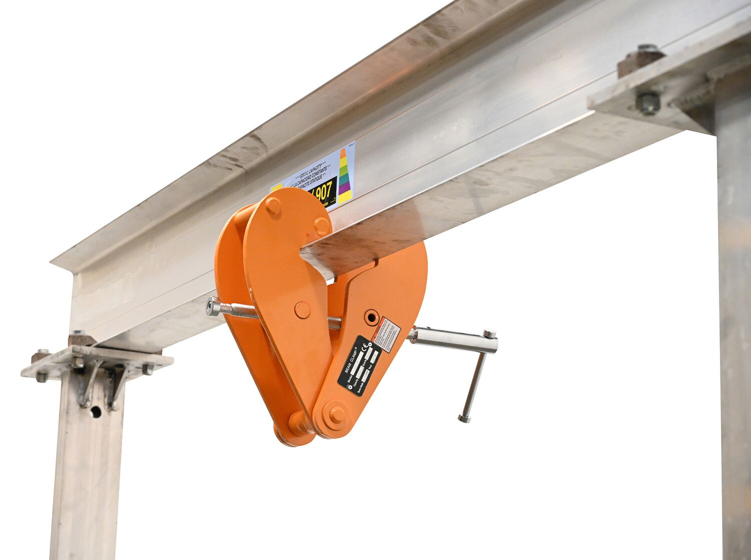 BC-8Designed to reduce the I-beam flange stress by distributing loads away from the flange edges during overhead lifting applications. These versatile units can be interchanged from one gantry to another in a matter of seconds with its easy mechanical adjustment mechanism. A bar is located at the bottom of the beam clamp for attaching a hoist (sold separately). Steel construction and painted finish.