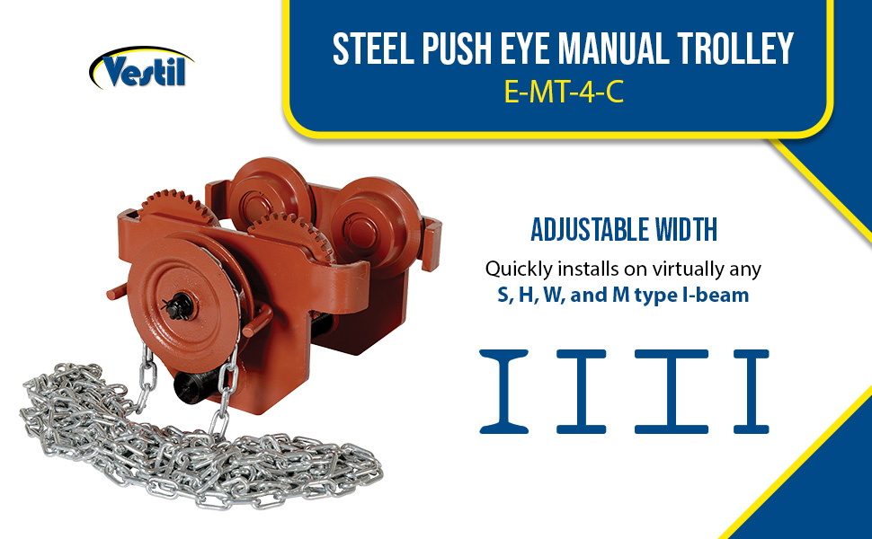 These trollies have been designed to quickly install on virtually any S, H,W, and M type I-beam. The width of the trolley is adjusted by rotating the center rod with lifting eye clockwise or counterclockwise. Once hoist (not included) is attached, center rod cannot be rotated which prevents trolley width from accidentally changing. Choose either push trolley or geared trolley. Geared trolley is ideal for use when precise positioning of the trolley is required. The trolley includes four rollers with sealed bearings for long life. A lifting eye is located at the bottom of the trolley for attaching a hoist (not included). Steel construction and painted finish. Headroom is measured from the bottom of wheel to bottom of hooking eye.