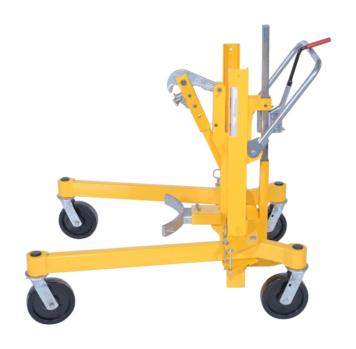 Unique portable unit designed to lift and transport steel, plastic, and fiber drums with a top lip. Steel jaw securely grips the top lip of the drum. Available with either a manual mechanical ratchet, foot pump hydraulic, or DC powered lift mechanism. Straddle legs rotate for access to drums on pallets. Units roll on four (4) 8" x 2" phenolic swivel casters. The push handle folds down for easy access to ratchet and foot pump. All welded steel construction. Baked-in powder coated toughness with a safety yellow finish. Optional scale weighs drums to an accuracy of +/-0.5 pounds. Optional scale includes (6) AA cell batteries and an AC adaptor.
