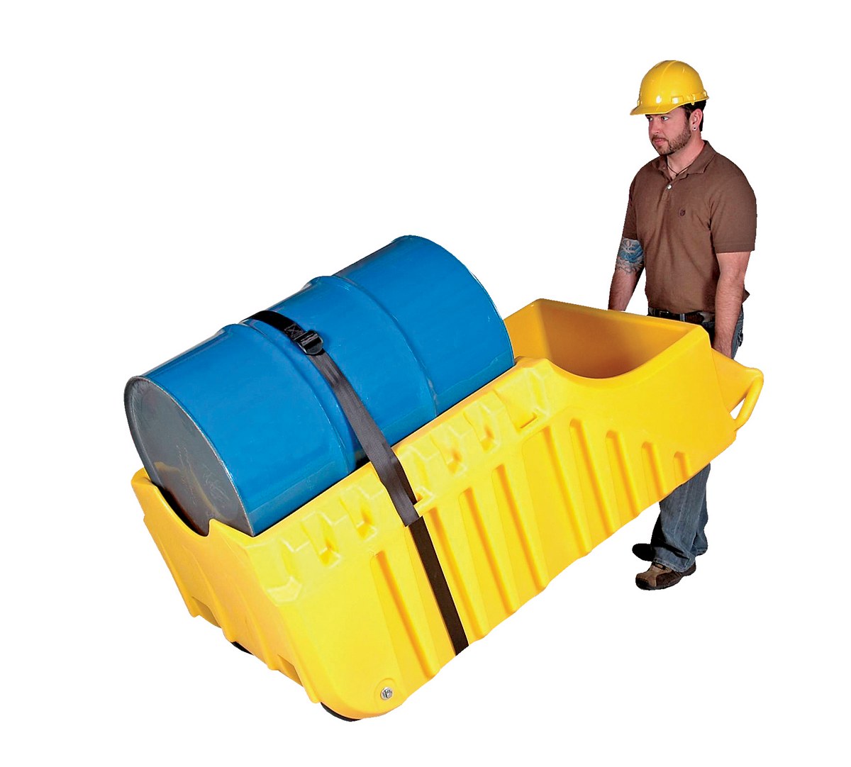 Drum handling, dispensing and containment all in one unit. Unlike alternative products, the open containment sump does not require spills to flow inside the double walls to meet EPA regulations -- easy to clean; eliminates residue concerns as related to compatibility. Can be used with 55 or 30 gallon drums, nylon strap keeps drums secure. Large 10" wheels roll easily over shop and factory floors.