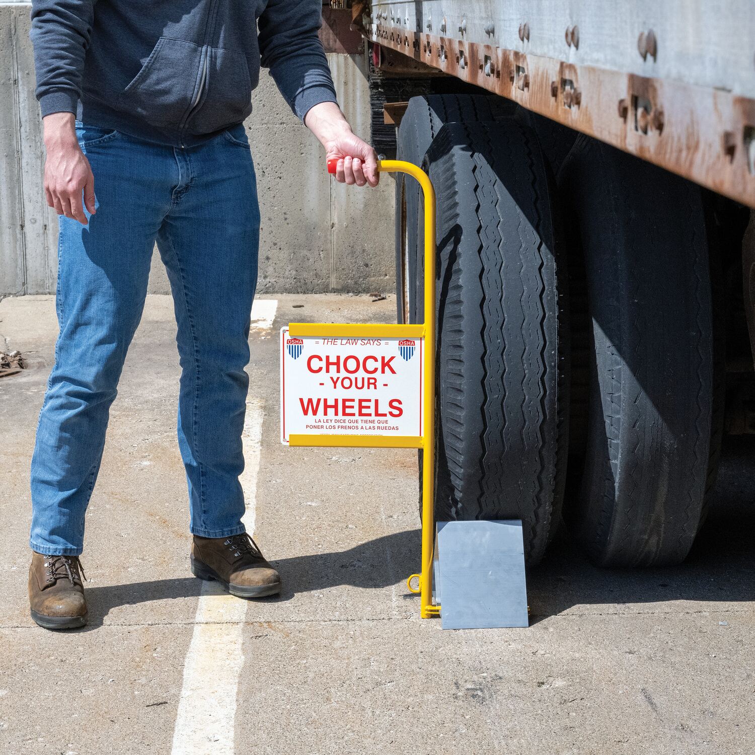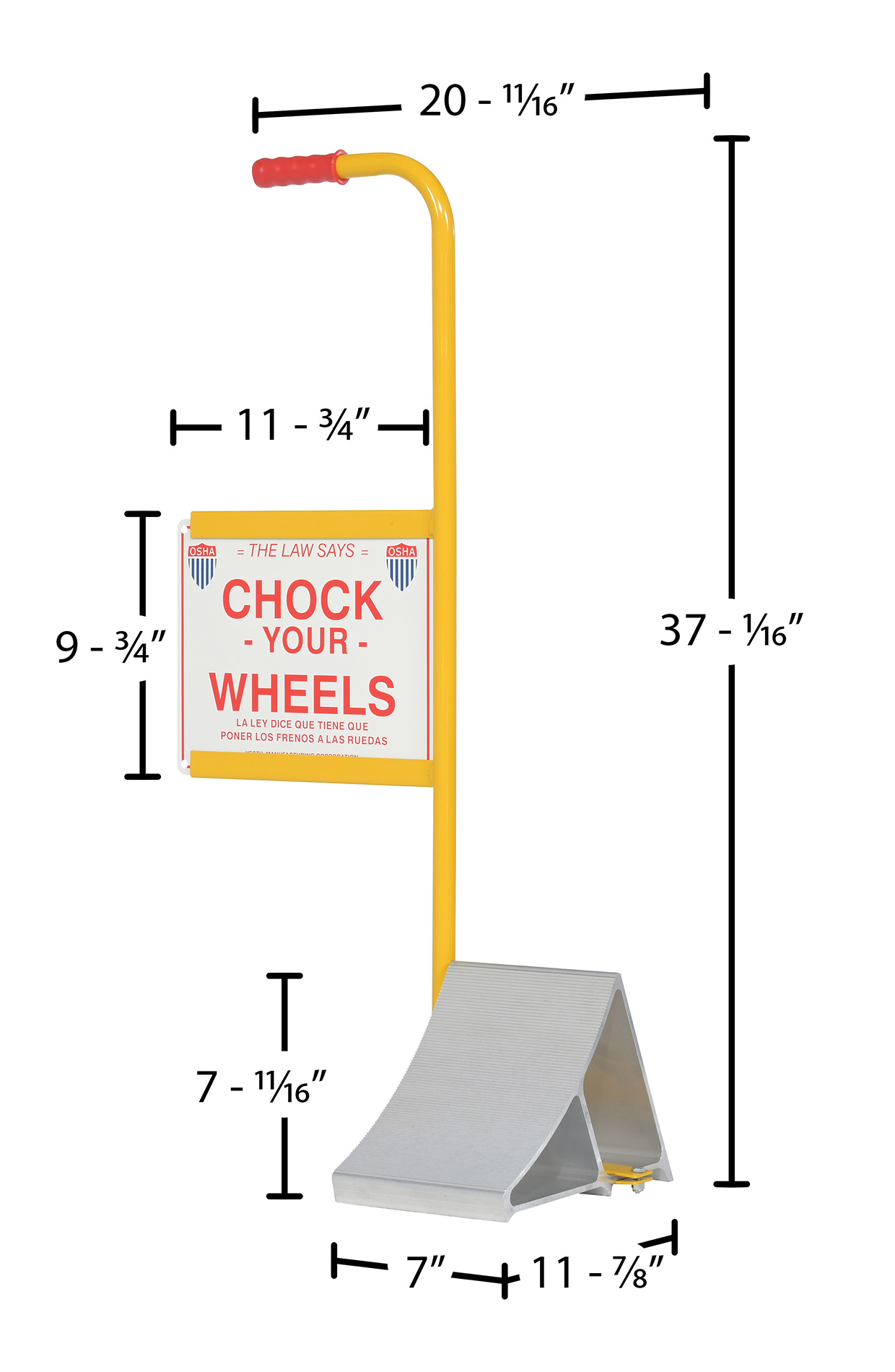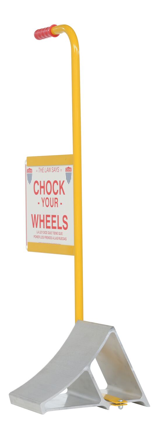 Constructed of extruded lightweight aluminum that is easy to handle. Features a serrated top to grip the tire and a triple edged bottom to grip the ground. Optional handle and sign attachment available. Customer signs available.