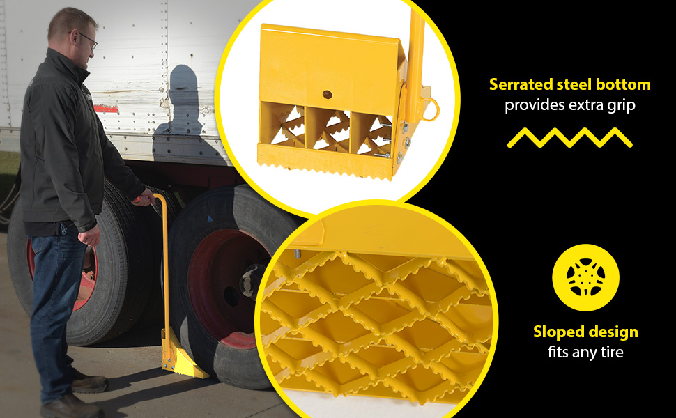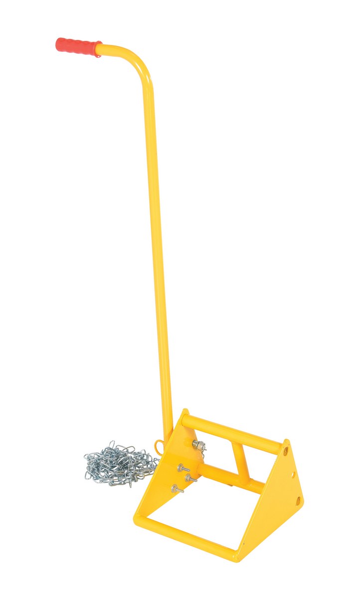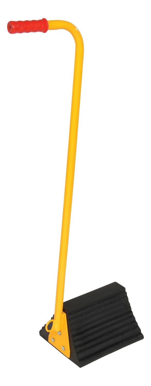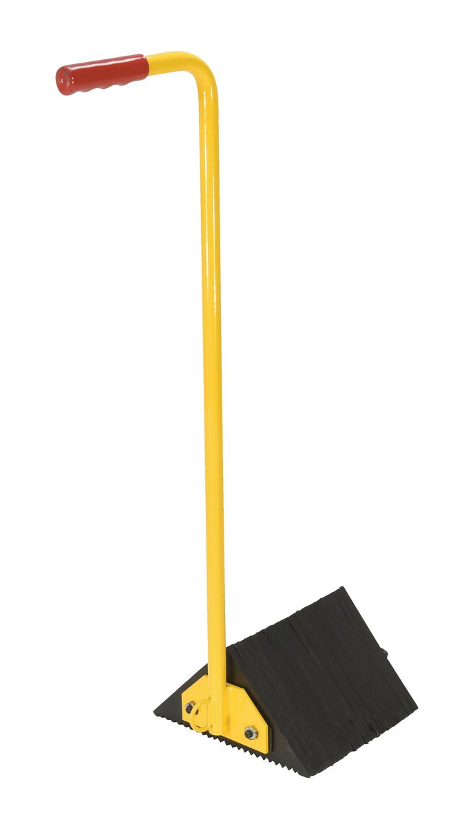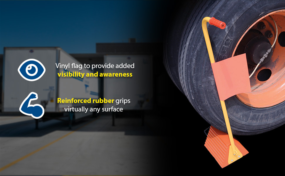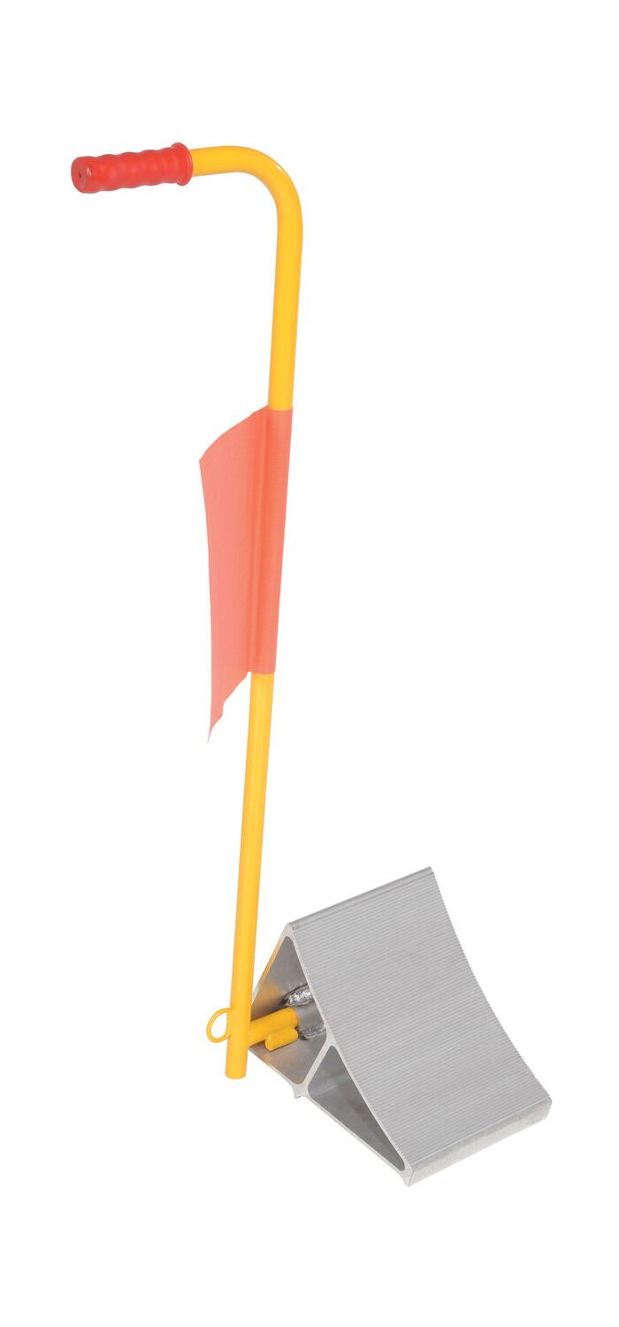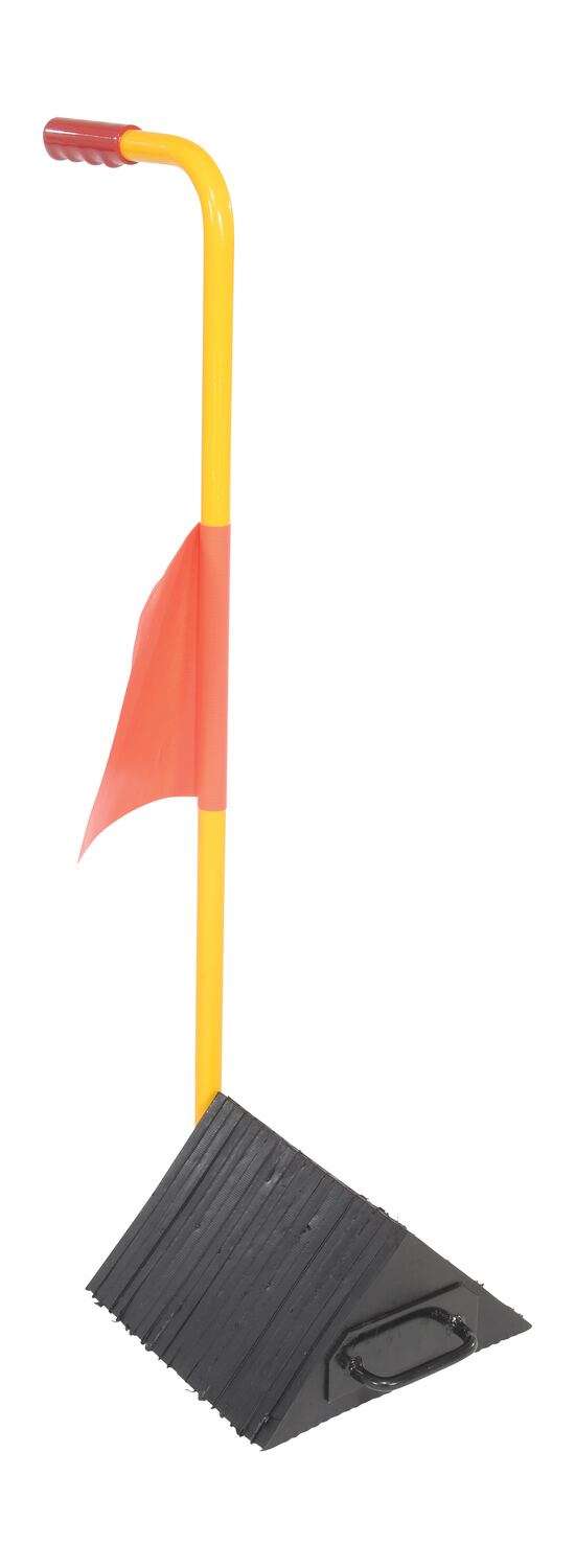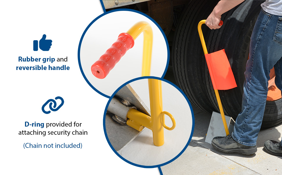 Ergonomically designed to make it easy to move wheel chocks in and out of position under trailer wheels. Reduce the risk of back, knee, and foot injuries. Handle is constructed of steel and includes a yellow baked-in powder-coated toughness. D-Ring provided for attaching security chain (chain not included.) Assembly required. High Visibility Flag |