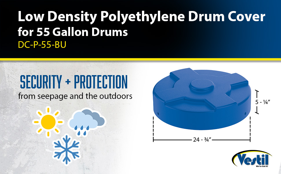 DC-P-55-UF-BU DC-P-55-UF-BULow Density Polyethylene Drum Cover 55 Gallon Universal Fit BlueOverall Diameter (in.): 24-5/8