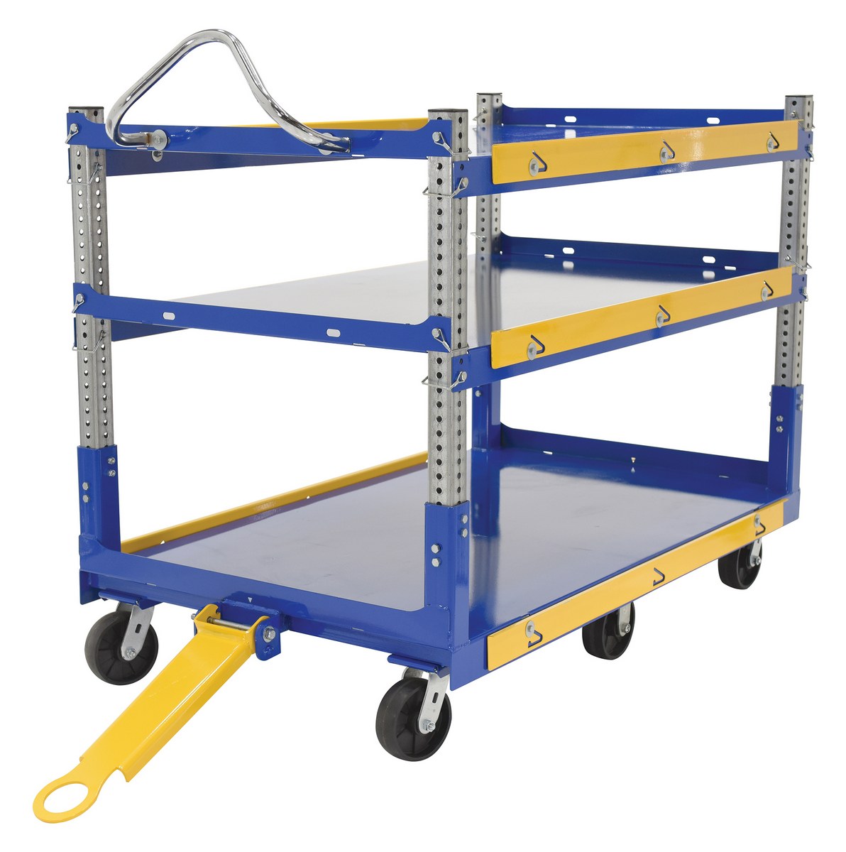 The adjustable ergonomic cart is the perfect asset to a number of facilities including shipping and handling to hospitality. A strong construction with a tall handle diminishes bending and twisting while loading and unloading products. The top two tiers can be adjusted in height with a simple pull of a pin to let larger sized products be transferred securely. The unit rolls on the users choice of glass-filled nylon or mold-on rubber casters for a smooth transition.