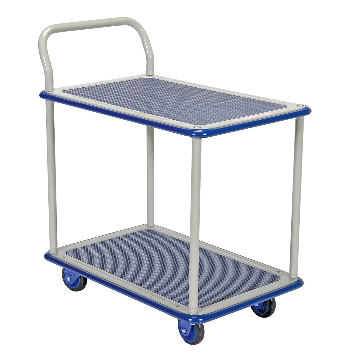 Manufactured from high quality steel. Durable pressed steel platform. Truck with a push/pull handle that folds for easy storage. Sturdy construction. Fitted with non-marking rubber protective buffer strip to protect walls and door frames when truck is in use. Non-slip PVC platform surface ensures maximum grip to eliminate movement of load when in transit. Optional front, rear, left, and right handles are available. Two (2) swivel and two (2) rigid low noise casters for sensitive environments and high quality double ball bearings. Double painted finish.