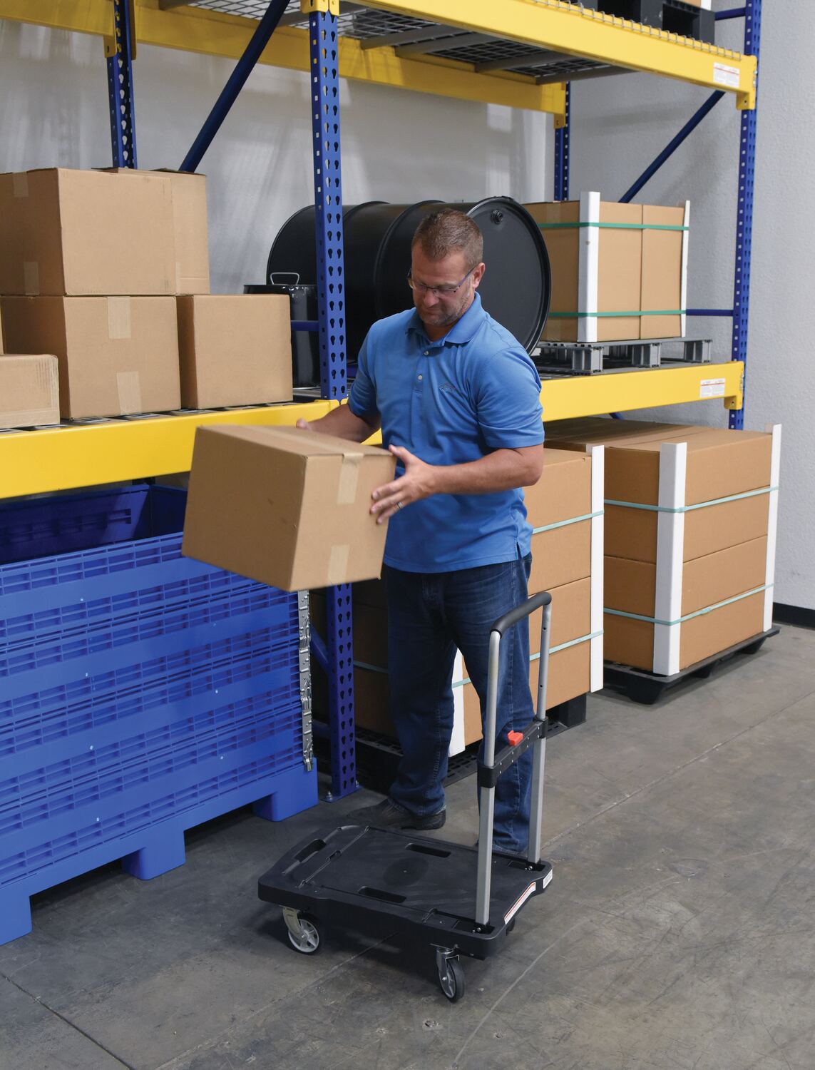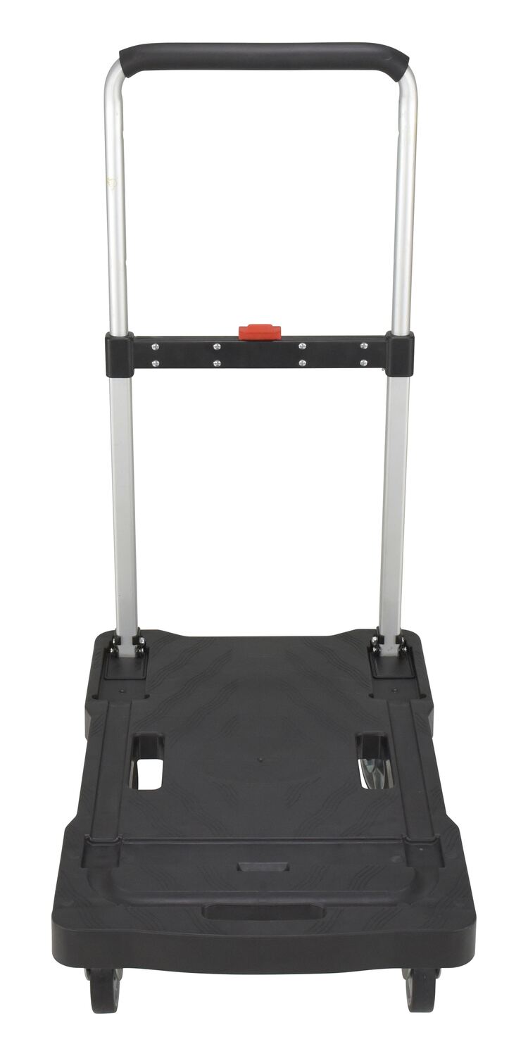 Unique cart folds completely flat for storage - telescopic handle folds down and casters fold up. Handle is adjustable to three different heights and features a cushion grip for comfort. Deck includes non-slip rubber grips and hand holes for easy carrying. Carts roll on two rigid and two swivel poly casters. Cart is constructed from plastic, steel and aluminum components.