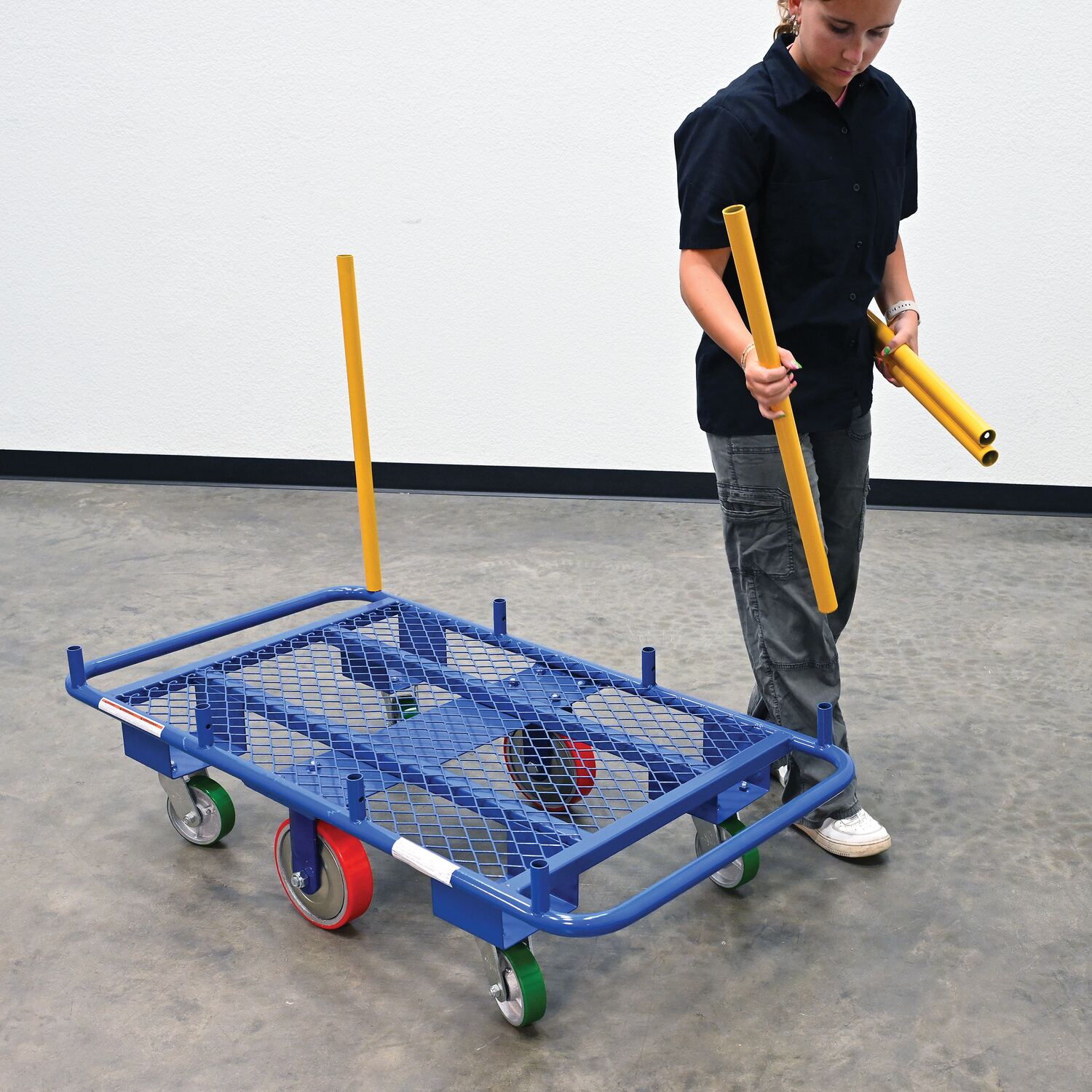 This two tier cart is great for handling panels and small items. The top dock is 40-15/16" high while the bottom dock is 11-2/3" off the ground. Four sliding posts can be locked in the up position to prevent products from sliding. Rolls on (4) 5" x 1-1/2" swivel and (2) 8" x 2" rigid casters. Center casters provides great maneuverability.