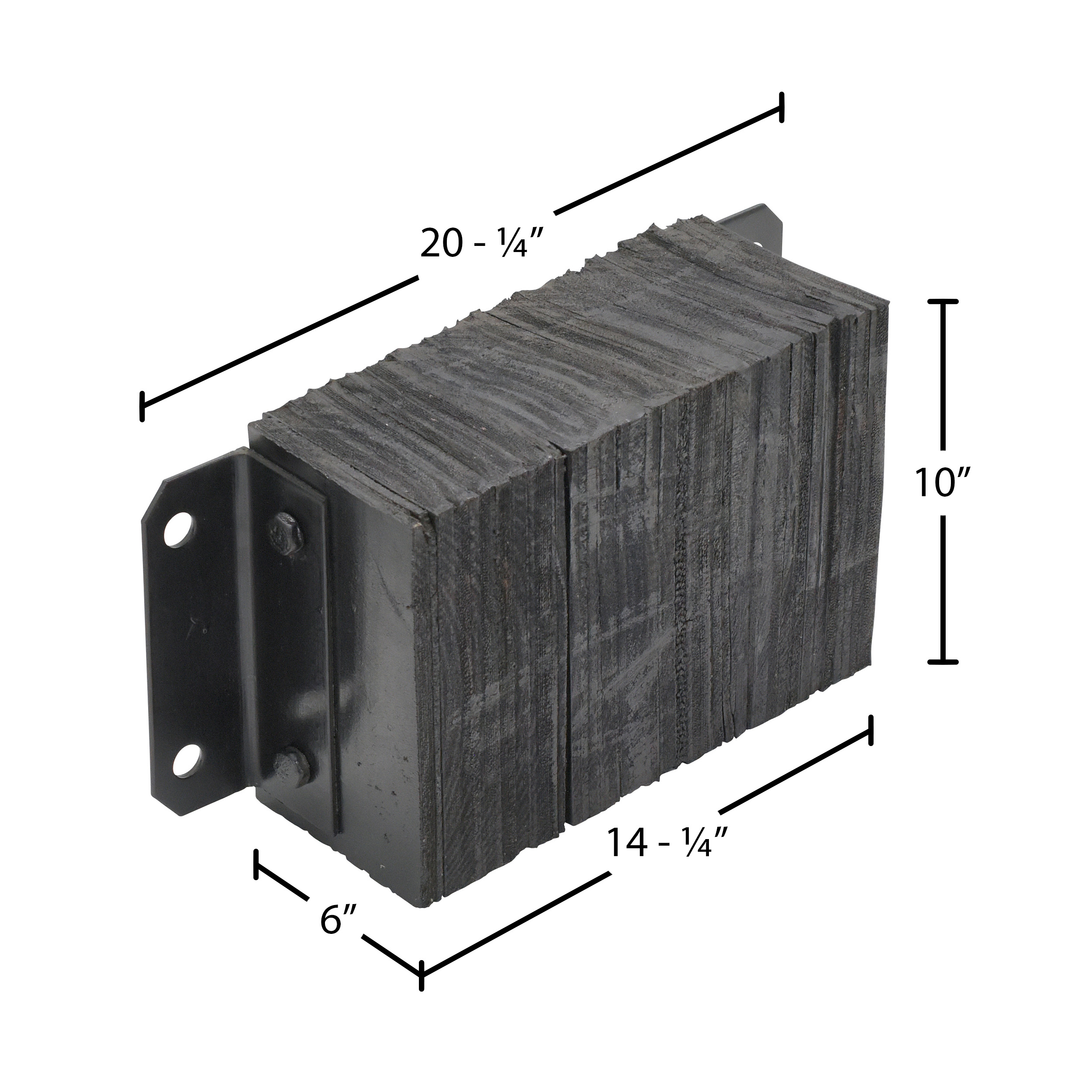 Laminated Rubber Dock Bumper 10 In. x 18 In. x 6 In. BlackThe laminated Dock Bumper provides durable, economical protection for loading docks and trailers. This unit is constructed of fabric reinforced rubber from recycled truck tires. The pads are laminated between painted structural angles and held together with steel tie rods. The width is bolt hole center to bolt hole center. Installation hardware sold separately.