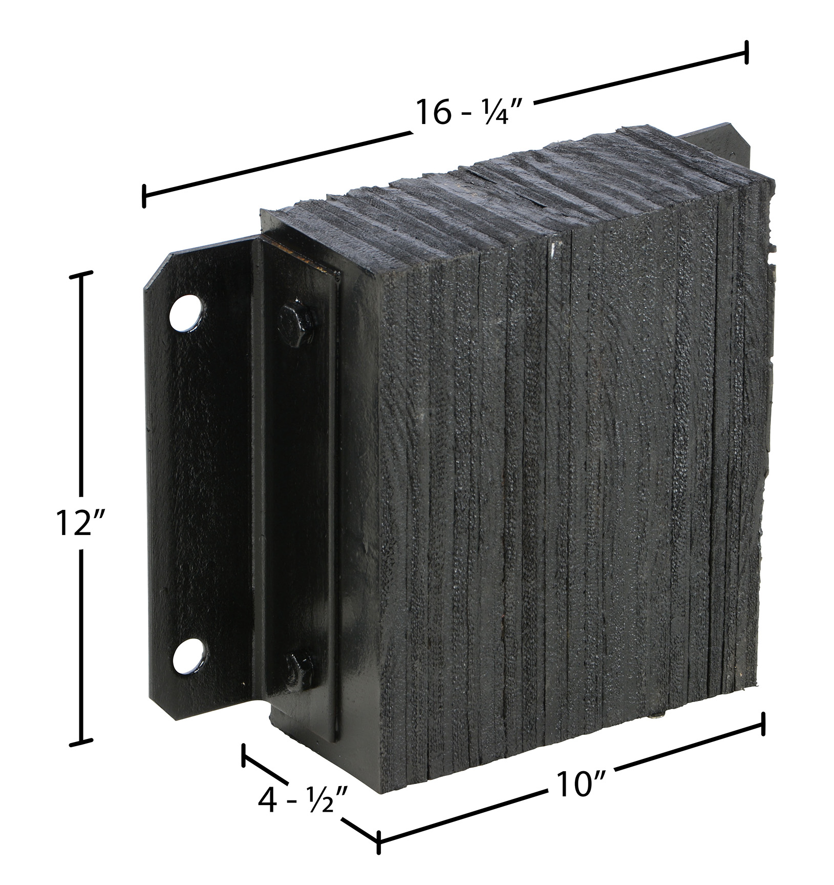 The laminated Dock Bumper provides durable, economical protection for loading docks and trailers. This unit is constructed of fabric reinforced rubber from recycled truck tires. The pads are laminated between painted structural angles and held together with steel tie rods. The width is bolt hole center to bolt hole center. Installation hardware sold separately.