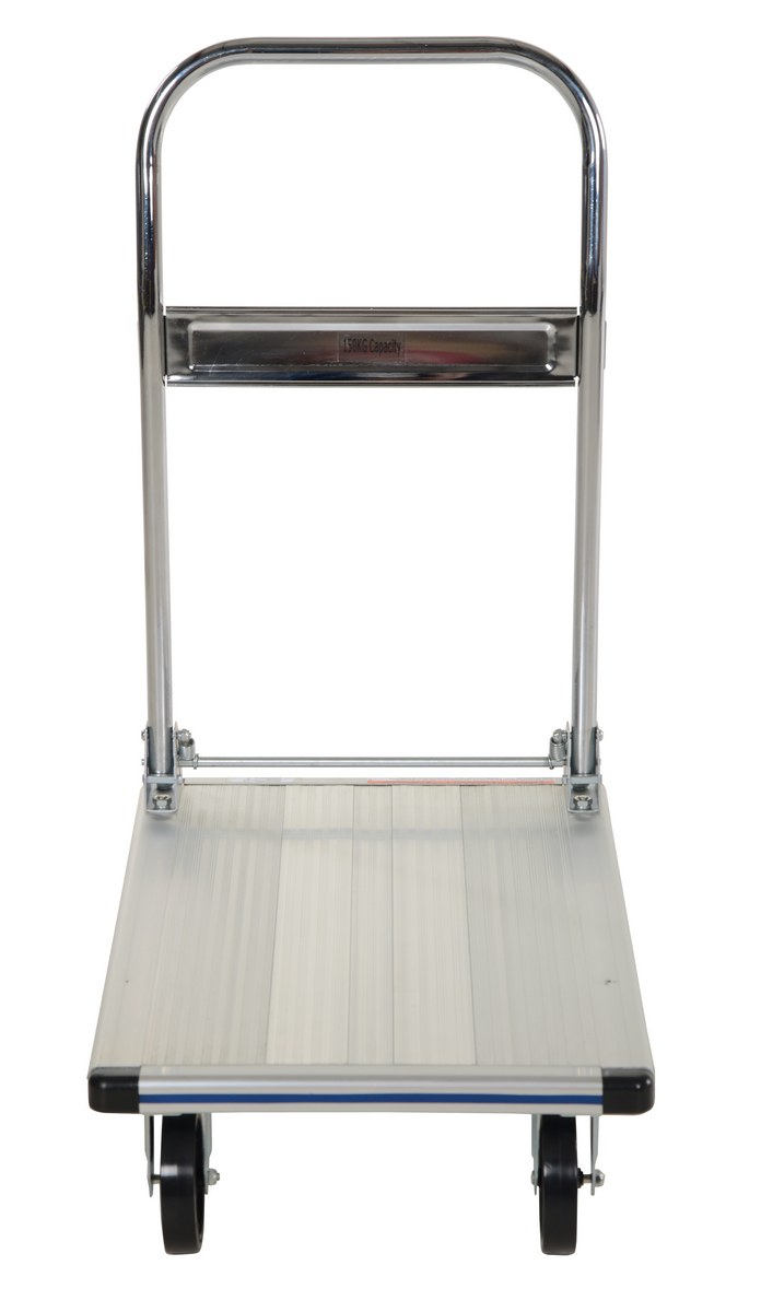 Aluminum Platform Truck With Polyurethane Casters 18-1/2 In. x 30 In. 400 Lb. Capacity SilverUse this Aluminum folding handle Platform Truck with non-marking casters for safe transportation of stacks of paper, small parts and other lightweight equipment. Ideal for maintenance rooms, offices, schools, hospitals, etc. Plastic corner protectors enhance durability and protect surroundings. The unit has a rugged aluminum construction with single handle design.
